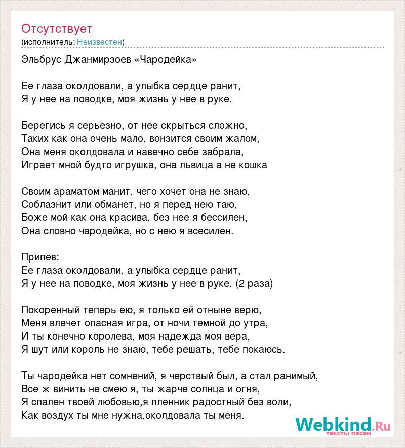 Эльбрус Джанмирзоев «Чародейка» Ее глаза околдовали, а улыбка сердце ранит, Я у нее на поводке, моя жизнь у нее в руке. Берегись я серьезно, от нее скрыться сложно, Таких как она очень мало, вонзится своим жалом, Она меня околдовала и навечно себе забрала, Играет мной будто игрушка, она львица а не кошка Своим араматом манит, чего хочет она не знаю, Соблазнит или обманет, но я перед нею таю, Боже мой как она красива, без нее я бессилен, Она словно чародейка, но с нею я всесилен. Припев: Ее глаза околдовали, а улыбка сердце ранит, Я у нее на поводке, моя жизнь у нее в руке. (2 раза) Покоренный теперь ею, я только ей отныне верю, Меня влечет опасная игра, от ночи темной до утра, И ты конечно королева, моя надежда моя вера, Я шут или король не знаю, тебе решать, тебе покаюсь. Ты чародейка нет сомнений, я черствый был, а стал ранимый, Все ж винить не смею я, ты жарче солнца и огня, Я спален твоей любовью,я пленник радостный без воли, Как воздух ты мне нужна,околдовала ты меня.