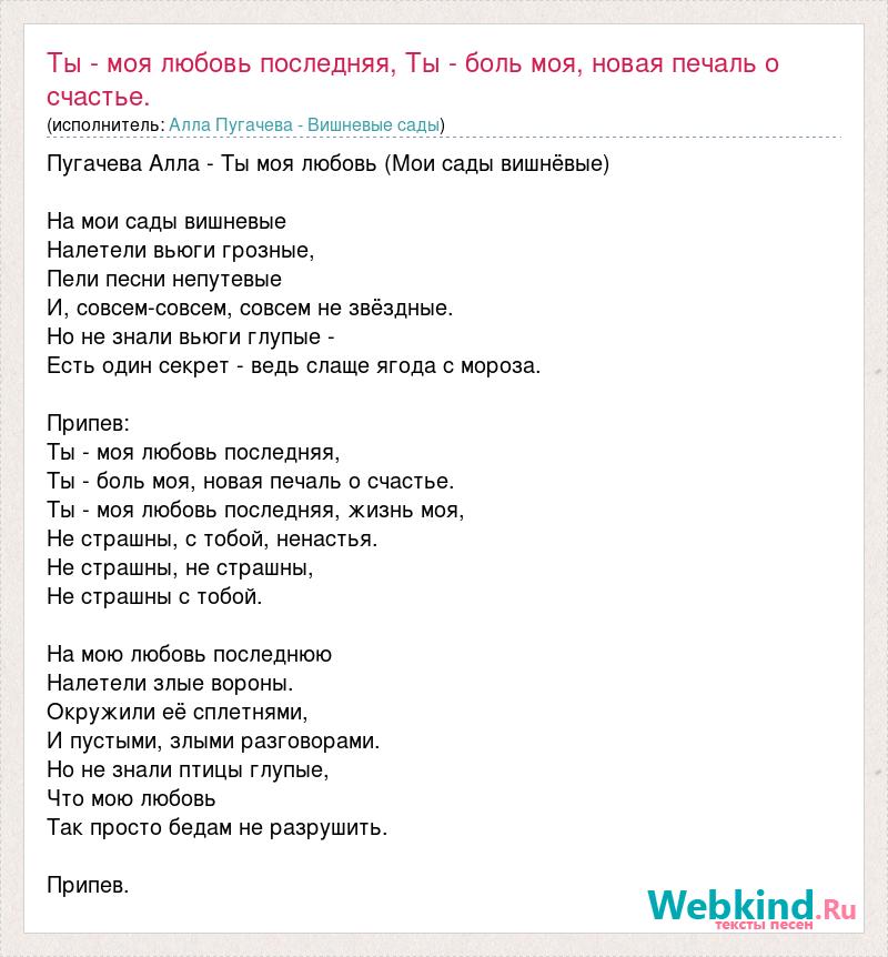 Пугачева Алла - Ты моя любовь (Мои сады вишнёвые) На мои сады вишневые Налетели вьюги грозные, Пели песни непутевые И, совсем-совсем, совсем не звёздные. Но не знали вьюги глупые - Есть один секрет - ведь слаще ягода с мороза. Припев: Ты - моя любовь последняя, Ты - боль моя, новая печаль о счастье. Ты - моя любовь последняя, жизнь моя, Не страшны, с тобой, ненастья. Не страшны, не страшны, Не страшны с тобой. На мою любовь последнюю Налетели злые вороны. Окружили её сплетнями, И пустыми, злыми разговорами. Но не знали птицы глупые, Что мою любовь Так просто бедам не разрушить. Припев.