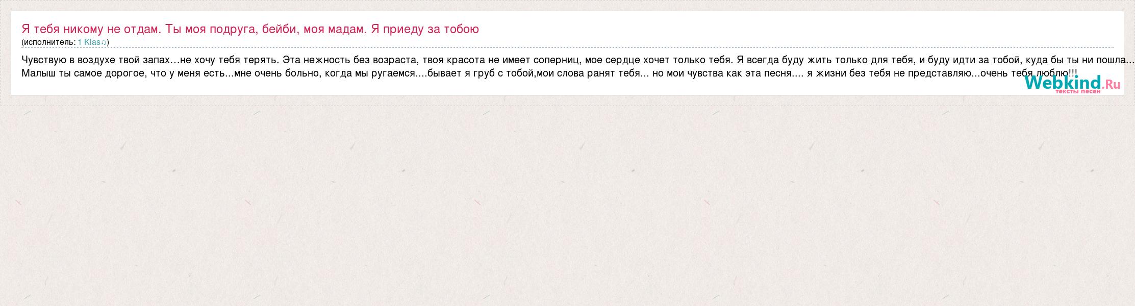 Главная→Исполнители→1 Klas♫→Я тебя никому не отдам. Ты моя подруга, бейби, моя мадам. Я приеду за тобою