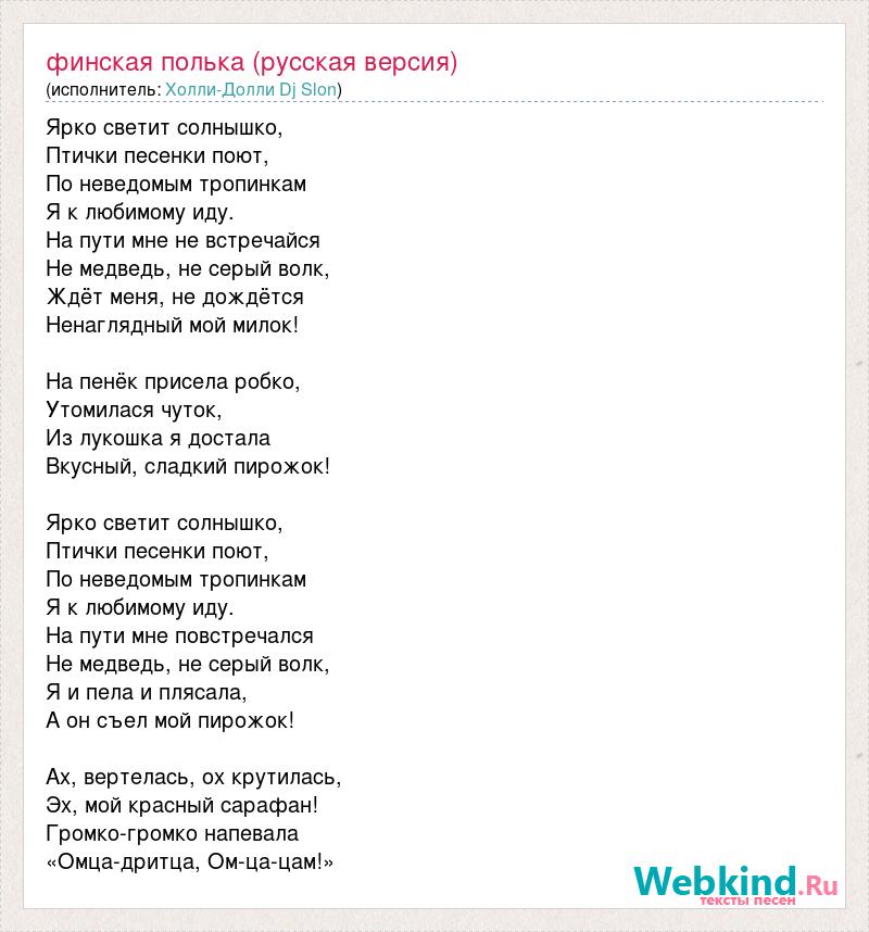 Ярко светит солнышко, Птички песенки поют, По неведомым тропинкам Я к любимому иду. На пути мне не встречайся Не медведь, не серый волк, Ждёт меня, не дождётся Ненаглядный мой милок! На пенёк присела робко, Утомилася чуток, Из лукошка я достала Вкусный, сладкий пирожок! Ярко светит солнышко, Птички песенки поют, По неведомым тропинкам Я к любимому иду. На пути мне повстречался Не медведь, не серый волк, Я и пела и плясала, А он съел мой пирожок! Ах, вертелась, ох крутилась, Эх, мой красный сарафан! Громко-громко напевала «Омца-дритца, Ом-ца-цам!»