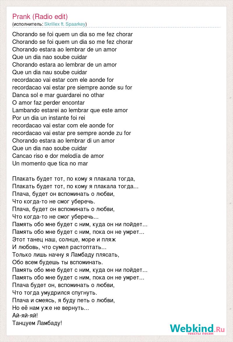 Chorando se foi quem un dia so me fez chorar Chorando se foi quem un dia so me fez chorar Chorando estara ao lembrar de un amor Que un dia nao soube cuidar Chorando estara ao lembrar de un amor Que un dia nau soube cuidar recordacao vai estar com ele aonde for recordacao vai estar pre siempre aonde su for Danca sol e mar guardarei no othar O amor faz perder encontar Lambando estarei ao lembrar que este amor Por un dia un instante foi rei recordacao vai estar com ele aonde for recordacao vai estar pre sempre aonde zu for Chorando estara ao lembrar di un amor Que un dia nao soube cuidar Cancao riso e dor melodía de amor Un momento que tica no mar Плакать будет тот, по кому я плакала тогда, Плакать будет тот, по кому я плакала тогда... Плача, будет он вспоминать о любви, Что когда-то не смог уберечь. Плача, будет он вспоминать о любви, Что когда-то не смог уберечь... Память обо мне будет с ним, куда он ни пойдет... Память обо мне будет с ним, пока он не умрет... Этот танец наш, солнце, море и пляж И любовь, что сумел растоптать... Только лишь начну я Ламбаду плясать, Обо всем будешь ты вспоминать. Память обо мне будет с ним, куда он ни пойдет... Память обо мне будет с ним, пока он не умрет... Плача будет он, вспоминать о любви, Что тогда умудрился спугнуть. Плача и смеясь, я буду петь о любви, Но её нам уже не вернуть... Ай-яй-яй! Танцуем Ламбаду!