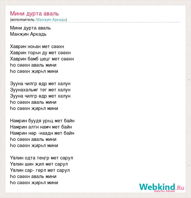 Мини дурта аваль Манҗин Аркадь Хаврин ноһан мет сәәхн Хаврин торһн ду мет сәәхн Хаврин бамб цецг мет сәәхн Һо сәәхн аваль мини Һо сәәхн җирһл мини Зууна чилгр өдр мет халун Зуунахальмг тег мет халун Зууна чилгр өдр мет халун Һо сәәхн аваль мини Һо сәәхн җирһл мини Намрин буудя урһц мет байн Намрин алтн намч мет байн Намрин нәр -наадн мет байн Һо сәәхн аваль мини Һо сәәхн җирһл мини Үвлин одта теңгр мет сарул Үвлин шин җил мет сарул Үвлин сар- герл мет сарул Һо сәәхн аваль мини Һо сәәхн җирһл мини
