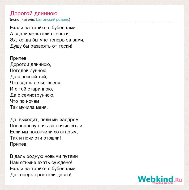 Ехали на тройке с бубенцами, А вдали мелькали огоньки... Эх, когда бы мне теперь за вами, Душу бы развеять от тоски! Припев: Дорогой длинною, Погодой лунною, Да с песней той, Что вдаль летит звеня, И с той старинною, Да с семиструнною, Что по ночам Так мучила меня. Да, выходит, пели мы задаром, Понапрасну ночь за ночью жгли. Если мы покончили со старым, Так и ночи эти отошли! Припев: В даль родную новыми путями Нам отныне ехать суждено! Ехали на тройке с бубенцами, Да теперь проехали давно!