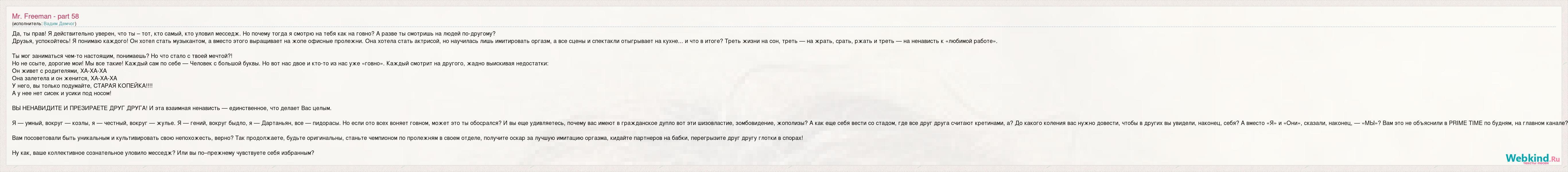 Да, ты прав! Я действительно уверен, что ты – тот, кто самый, кто уловил месседж. Но почему тогда я смотрю на тебя как на говно? А разве ты смотришь на людей по-другому? Друзья, успокойтесь! Я понимаю каждого! Он хотел стать музыкантом, а вместо этого выращивает на жопе офисные пролежни. Она хотела стать актрисой, но научилась лишь имитировать оргазм, а все сцены и спектакли отыгрывает на кухне... и что в итоге? Треть жизни на сон, треть — на жрать, срать, ржать и треть — на ненависть к «любимой работе». Ты мог заниматься чем-то настоящим, понимаешь? Но что стало с твоей мечтой?! Но не ссыте, дорогие мои! Мы все такие! Каждый сам по себе — Человек с большой буквы. Но вот нас двое и кто-то из нас уже «говно». Каждый смотрит на другого, жадно выискивая недостатки: Он живет с родителями, ХА-ХА-ХА Она залетела и он женится, ХА-ХА-ХА У него, вы только подумайте, СТАРАЯ КОПЕЙКА!!!! А у нее нет сисек и усики под носом! ВЫ НЕНАВИДИТЕ И ПРЕЗИРАЕТЕ ДРУГ ДРУГА! И эта взаимная ненависть — единственное, что делает Вас целым. Я — умный, вокруг — козлы, я — честный, вокруг — жулье. Я — гений, вокруг быдло, я — Дартаньян, все — пидорасы. Но если ото всех воняет говном, может это ты обосрался? И вы еще удивляетесь, почему вас имеют в гражданское дупло вот эти шизовластие, зомбовидение, жополизы? А как еще себя вести со стадом, где все друг друга считают кретинами, а? До какого коления вас нужно довести, чтобы в других вы увидели, наконец, себя? А вместо «Я» и «Они», сказали, наконец, — «МЫ»? Вам это не объяснили в PRIME TIME по будням, на главном канале? Вам посоветовали быть уникальным и культивировать свою непохожесть, верно? Так продолжаете, будьте оригинальны, станьте чемпионом по пролежням в своем отделе, получите оскар за лучшую имитацию оргазма, кидайте партнеров на бабки, перегрызите друг другу глотки в спорах! Ну как, ваше коллективное сознательное уловило месседж? Или вы по–прежнему чувствуете себя избранным?