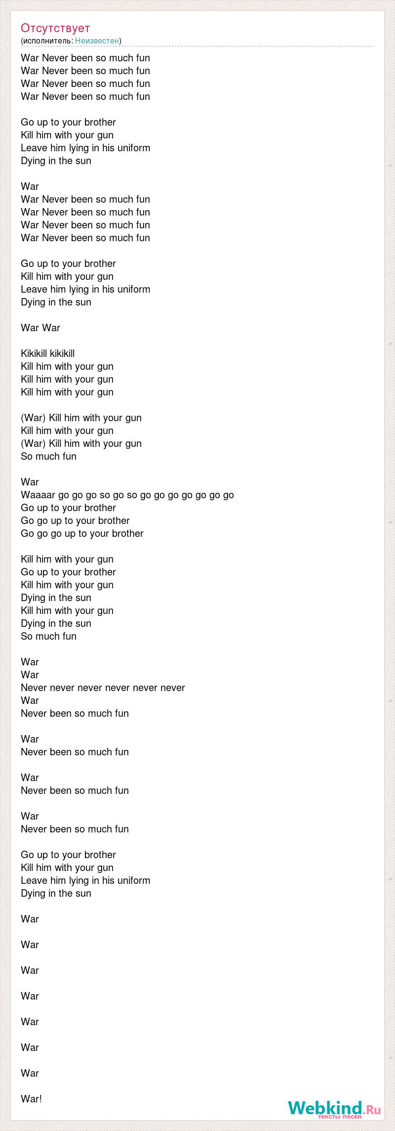 War Never been so much fun War Never been so much fun War Never been so much fun War Never been so much fun Go up to your brother Kill him with your gun Leave him lying in his uniform Dying in the sun War War Never been so much fun War Never been so much fun War Never been so much fun War Never been so much fun Go up to your brother Kill him with your gun Leave him lying in his uniform Dying in the sun War War Kikikill kikikill Kill him with your gun Kill him with your gun Kill him with your gun (War) Kill him with your gun Kill him with your gun (War) Kill him with your gun So much fun War Waaaar go go go so go so go go go go go go go Go up to your brother Go go up to your brother Go go go up to your brother Kill him with your gun Go up to your brother Kill him with your gun Dying in the sun Kill him with your gun Dying in the sun So much fun War War Never never never never never never War Never been so much fun War Never been so much fun War Never been so much fun War Never been so much fun Go up to your brother Kill him with your gun Leave him lying in his uniform Dying in the sun War War War War War War War War!