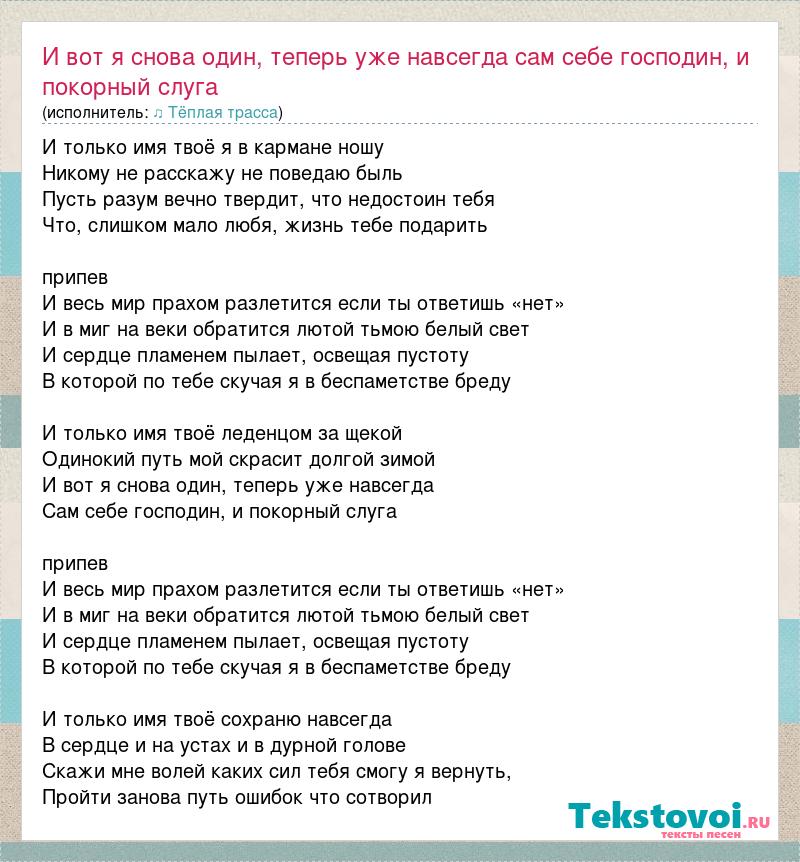 И только имя твоё я в кармане ношу Никому не расскажу не поведаю быль Пусть разум вечно твердит, что недостоин тебя Что, слишком мало любя, жизнь тебе подарить припев И весь мир прахом разлетится если ты ответишь «нет» И в миг на веки обратится лютой тьмою белый свет И сердце пламенем пылает, освещая пустоту В которой по тебе скучая я в беспаметстве бреду И только имя твоё леденцом за щекой Одинокий путь мой скрасит долгой зимой И вот я снова один, теперь уже навсегда Сам себе господин, и покорный слуга припев И весь мир прахом разлетится если ты ответишь «нет» И в миг на веки обратится лютой тьмою белый свет И сердце пламенем пылает, освещая пустоту В которой по тебе скучая я в беспаметстве бреду И только имя твоё сохраню навсегда В сердце и на устах и в дурной голове Скажи мне волей каких сил тебя смогу я вернуть, Пройти занова путь ошибок что сотворил