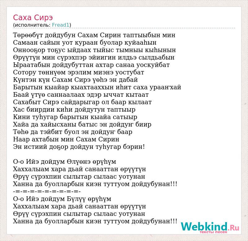 Төрөөбүт дойдубун Сахам Сирин таптыыбын мин Самаан сайын уот кураан буолар куйааһын Оннооҕор тоҕус ыйдаах тыйыс тымныы кыһынын Өрүүтүн мин сүрэхпэр эйиигин илдьэ сылдьабын Ыраатабын дойдубуттан ахтар санаа уоскуйбат Сотору төннүөм эрэлим миэнэ уостубат Күнтэн күн Сахам Сирэ үөһэ эн дабай Барытын кыайар кыахтааххын иһит саха урааҥхай Баай үтүө саннаалаах эдэр ыччат кытаат Сахабыт Сирэ сайдарыгар ол баар кылаат Хас биирдии киһи дойдутун таптыыр Кини туһугар барытын кыайа сатыыр Хайа да хайысханы батыс эн дойдуҥ биир Төһө да тэйбит буол эн дойдуҥ баар Наар ахтабын мин Сахам Сирин Эн истиий доҕор дойдун туһугар бэрин! О-о Ийэ дойдум Өлүөнэ өрүһүм Хаххалыам хара дьай санааттан өрүүтүн Өрүү сүрэхпин сылытар сылаас уотунан Ханна да буолларбын киэн туттуом дойдубунан!!! -=-=-=-=-=-=-=-=-=- О-о Ийэ дойдум Бүлүү өрүһүм Хаххалыам хара дьай санааттан өрүүтүн Өрүү сүрэхпин сылытар сылаас уотунан Ханна да буолларбын киэн туттуом дойдубунан!!!