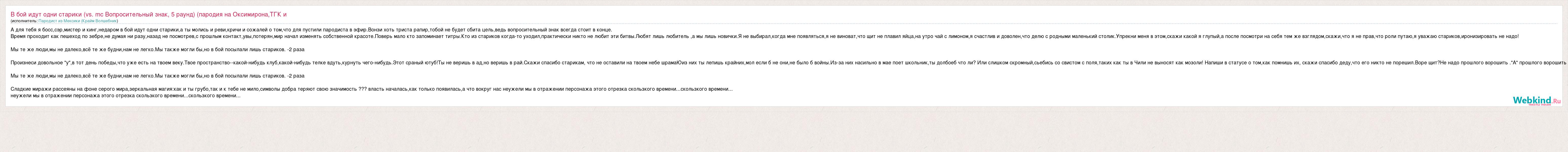 Главная→Исполнители→Пародист из Мексики (Крайм Волшебник→В бой идут одни старики (vs. mc Вопросительный знак, 5 раунд) (пародия на Оксим
