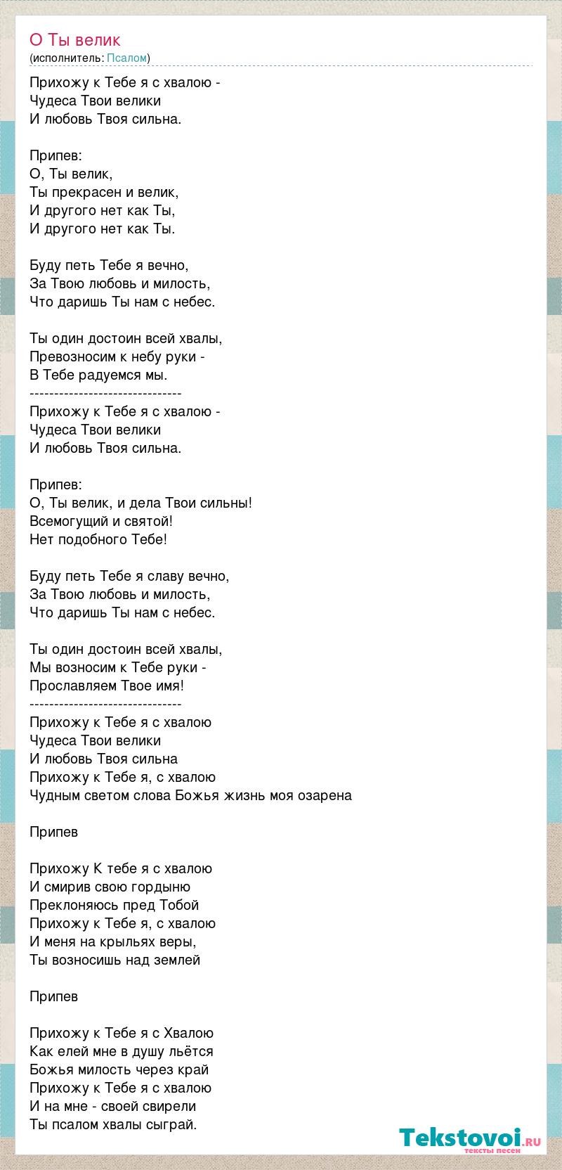 Прихожу к Тебе я с хвалою - Чудеса Твои велики И любовь Твоя сильна. Припев: О, Ты велик, Ты прекрасен и велик, И другого нет как Ты, И другого нет как Ты. Буду петь Тебе я вечно, За Твою любовь и милость, Что даришь Ты нам с небес. Ты один достоин всей хвалы, Превозносим к небу руки - В Тебе радуемся мы. ------------------------------- Прихожу к Тебе я с хвалою - Чудеса Твои велики И любовь Твоя сильна. Припев: О, Ты велик, и дела Твои сильны! Всемогущий и святой! Нет подобного Тебе! Буду петь Тебе я славу вечно, За Твою любовь и милость, Что даришь Ты нам с небес. Ты один достоин всей хвалы, Мы возносим к Тебе руки - Прославляем Твое имя! ------------------------------- Прихожу к Тебе я с хвалою Чудеса Твои велики И любовь Твоя сильна Прихожу к Тебе я, с хвалою Чудным светом слова Божья жизнь моя озарена Припев Прихожу К тебе я с хвалою И смирив свою гордыню Преклоняюсь пред Тобой Прихожу к Тебе я, с хвалою И меня на крыльях веры, Ты возносишь над землей Припев Прихожу к Тебе я с Хвалою Как елей мне в душу льётся Божья милость через край Прихожу к Тебе я с хвалою И на мне - своей свирели Ты псалом хвалы сыграй.