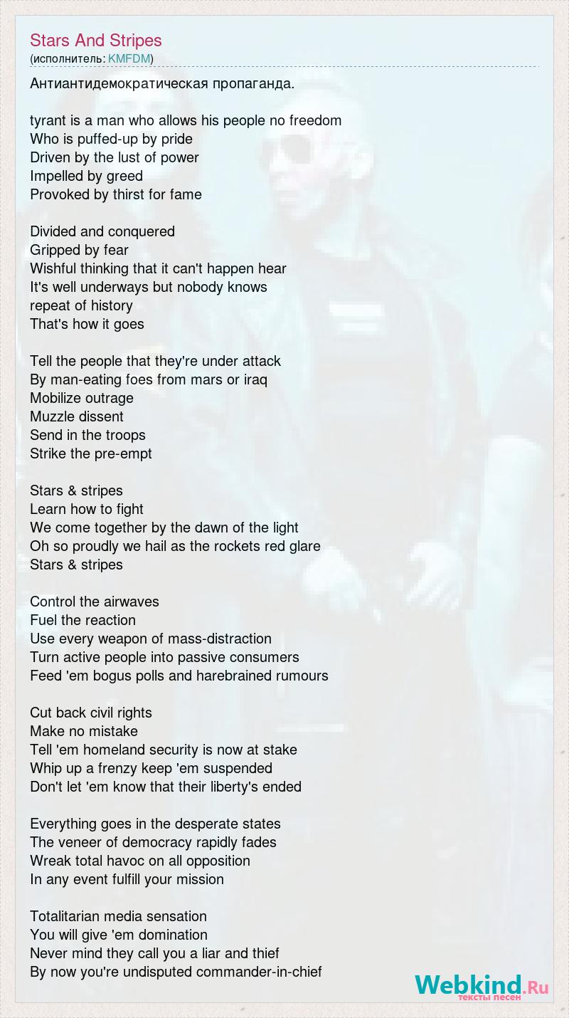 Антиантидемократическая пропаганда. tyrant is a man who allows his people no freedom Who is puffed-up by pride Driven by the lust of power Impelled by greed Provoked by thirst for fame Divided and conquered Gripped by fear Wishful thinking that it can't happen hear It's well underways but nobody knows repeat of history That's how it goes Tell the people that they're under attack By man-eating foes from mars or iraq Mobilize outrage Muzzle dissent Send in the troops Strike the pre-empt Stars & stripes Learn how to fight We come together by the dawn of the light Oh so proudly we hail as the rockets red glare Stars & stripes Control the airwaves Fuel the reaction Use every weapon of mass-distraction Turn active people into passive consumers Feed 'em bogus polls and harebrained rumours Cut back civil rights Make no mistake Tell 'em homeland security is now at stake Whip up a frenzy keep 'em suspended Don't let 'em know that their liberty's ended Everything goes in the desperate states The veneer of democracy rapidly fades Wreak total havoc on all opposition In any event fulfill your mission Totalitarian media sensation You will give 'em domination Never mind they call you a liar and thief By now you're undisputed commander-in-chief