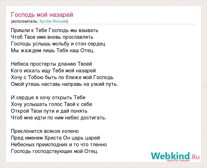 Пришли к Тебе Господь мы взывать Чтоб Твое имя вновь прославлять Господь услышь мольбу и стон сердец Мы жаждем лишь Тебя наш Отец. Небеса простерты дланию Твоей Кого искать ищу Тебя мой назарей Хочу с Тобою быть по ближе мой Господь Омой утешь наставь направь на узкий путь. И сердце я хочу открыть Тебе Хочу услышать голос Твой к себе Открой Твои пути и дай понять Чтоб мне идти по ним небес достигать. Преклонится всякое колено Пред именем Христа Он царь царей Небесных преисподних и то что тленно Господь господствующих мой Отец.