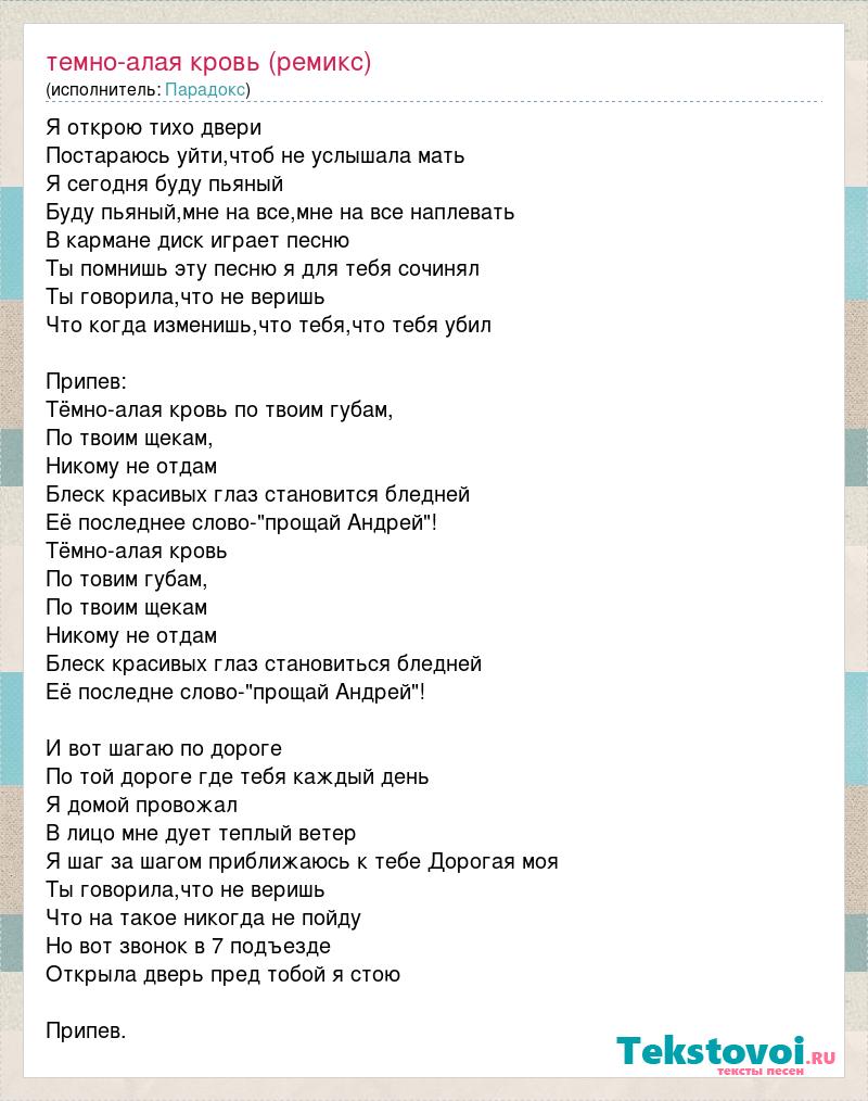 Я открою тихо двери Постараюсь уйти,чтоб не услышала мать Я сегодня буду пьяный Буду пьяный,мне на все,мне на все наплевать В кармане диск играет песню Ты помнишь эту песню я для тебя сочинял Ты говорила,что не веришь Что когда изменишь,что тебя,что тебя убил Припев: Тёмно-алая кровь по твоим губам, По твоим щекам, Никому не отдам Блеск красивых глаз становится бледней Её последнее слово-"прощай Андрей"! Тёмно-алая кровь По товим губам, По твоим щекам Никому не отдам Блеск красивых глаз становиться бледней Её последне слово-"прощай Андрей"! И вот шагаю по дороге По той дороге где тебя каждый день Я домой провожал В лицо мне дует теплый ветер Я шаг за шагом приближаюсь к тебе Дорогая моя Ты говорила,что не веришь Что на такое никогда не пойду Но вот звонок в 7 подъезде Открыла дверь пред тобой я стою Припев.