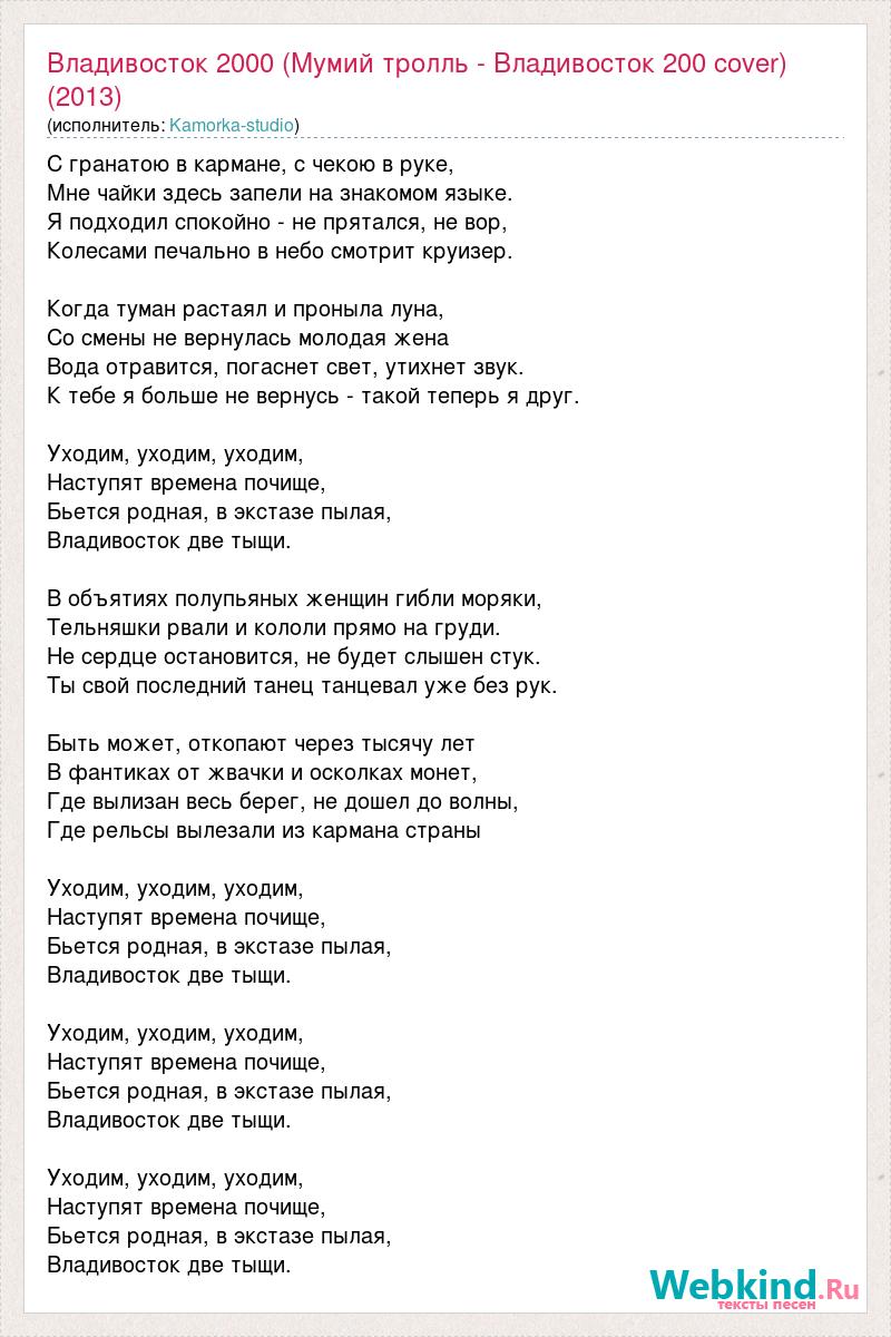 С гранатою в кармане, с чекою в руке, Мне чайки здесь запели на знакомом языке. Я подходил спокойно - не прятался, не вор, Колесами печально в небо смотрит круизер. Когда туман растаял и проныла луна, Со смены не вернулась молодая жена Вода отравится, погаснет свет, утихнет звук. К тебе я больше не вернусь - такой теперь я друг. Уходим, уходим, уходим, Наступят времена почище, Бьется родная, в экстазе пылая, Владивосток две тыщи. В объятиях полупьяных женщин гибли моряки, Тельняшки рвали и кололи прямо на груди. Не сердце остановится, не будет слышен стук. Ты свой последний танец танцевал уже без рук. Быть может, откопают через тысячу лет В фантиках от жвачки и осколках монет, Где вылизан весь берег, не дошел до волны, Где рельсы вылезали из кармана страны Уходим, уходим, уходим, Наступят времена почище, Бьется родная, в экстазе пылая, Владивосток две тыщи. Уходим, уходим, уходим, Наступят времена почище, Бьется родная, в экстазе пылая, Владивосток две тыщи. Уходим, уходим, уходим, Наступят времена почище, Бьется родная, в экстазе пылая, Владивосток две тыщи.