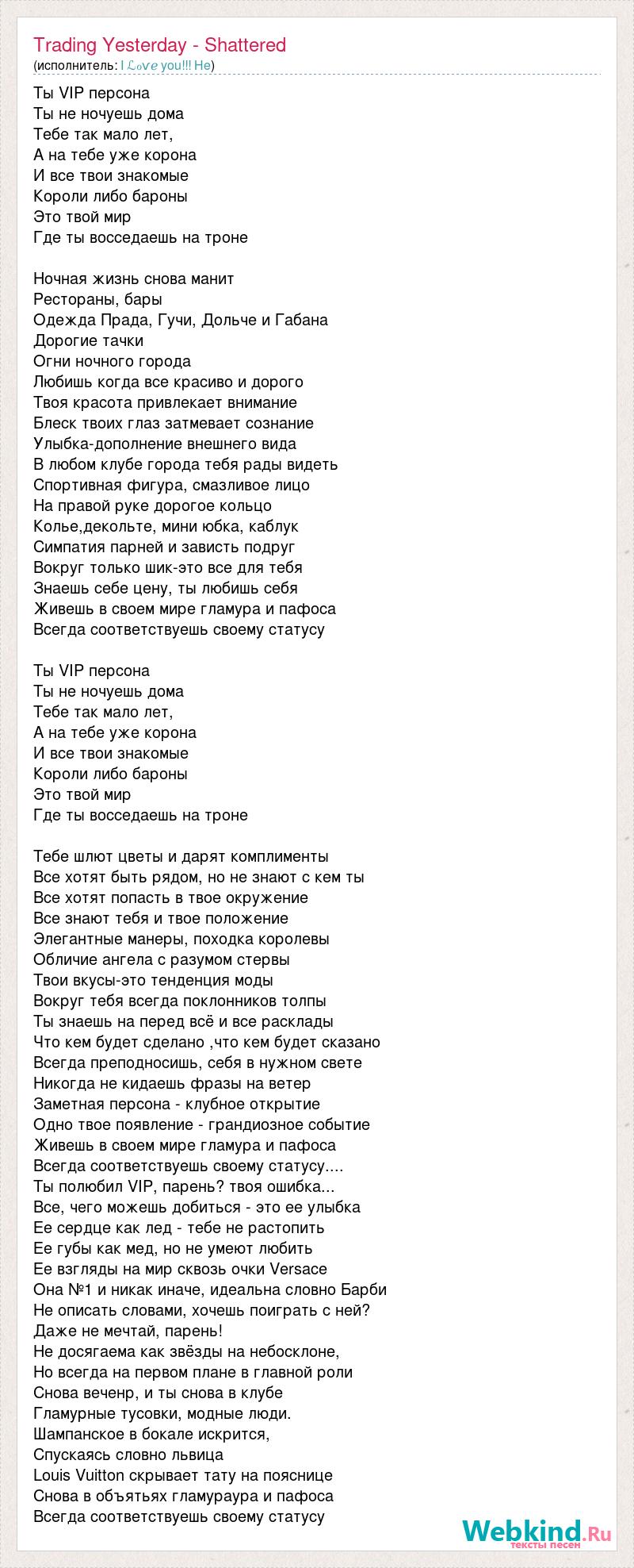 Ты VIP персона Ты не ночуешь дома Тебе так мало лет, А на тебе уже корона И все твои знакомые Короли либо бароны Это твой мир Где ты восседаешь на троне Ночная жизнь снова манит Рестораны, бары Одежда Прада, Гучи, Дольче и Габана Дорогие тачки Огни ночного города Любишь когда все красиво и дорого Твоя красота привлекает внимание Блеск твоих глаз затмевает сознание Улыбка-дополнение внешнего вида В любом клубе города тебя рады видеть Спортивная фигура, смазливое лицо На правой руке дорогое кольцо Колье,декольте, мини юбка, каблук Симпатия парней и зависть подруг Вокруг только шик-это все для тебя Знаешь себе цену, ты любишь себя Живешь в своем мире гламура и пафоса Всегда соответствуешь своему статусу Ты VIP персона Ты не ночуешь дома Тебе так мало лет, А на тебе уже корона И все твои знакомые Короли либо бароны Это твой мир Где ты восседаешь на троне Тебе шлют цветы и дарят комплименты Все хотят быть рядом, но не знают с кем ты Все хотят попасть в твое окружение Все знают тебя и твое положение Элегантные манеры, походка королевы Обличие ангела с разумом стервы Твои вкусы-это тенденция моды Вокруг тебя всегда поклонников толпы Ты знаешь на перед всё и все расклады Что кем будет сделано ,что кем будет сказано Всегда преподносишь, себя в нужном свете Никогда не кидаешь фразы на ветер Заметная персона - клубное открытие Одно твое появление - грандиозное событие Живешь в своем мире гламура и пафоса Всегда соответствуешь своему статусу.... Ты полюбил VIP, парень? твоя ошибка... Все, чего можешь добиться - это ее улыбка Ее сердце как лед - тебе не растопить Ее губы как мед, но не умеют любить Ее взгляды на мир сквозь очки Versace Она №1 и никак иначе, идеальна словно Барби Не описать словами, хочешь поиграть с ней? Даже не мечтай, парень! Не досягаема как звёзды на небосклоне, Но всегда на первом плане в главной роли Снова веченр, и ты снова в клубе Гламурные тусовки, модные люди. Шампанское в бокале искрится, Спускаясь словно львица Louis Vuitton скрывает тату на пояснице Снова в объятьях гламураура и пафоса Всегда соответствуешь своему статусу