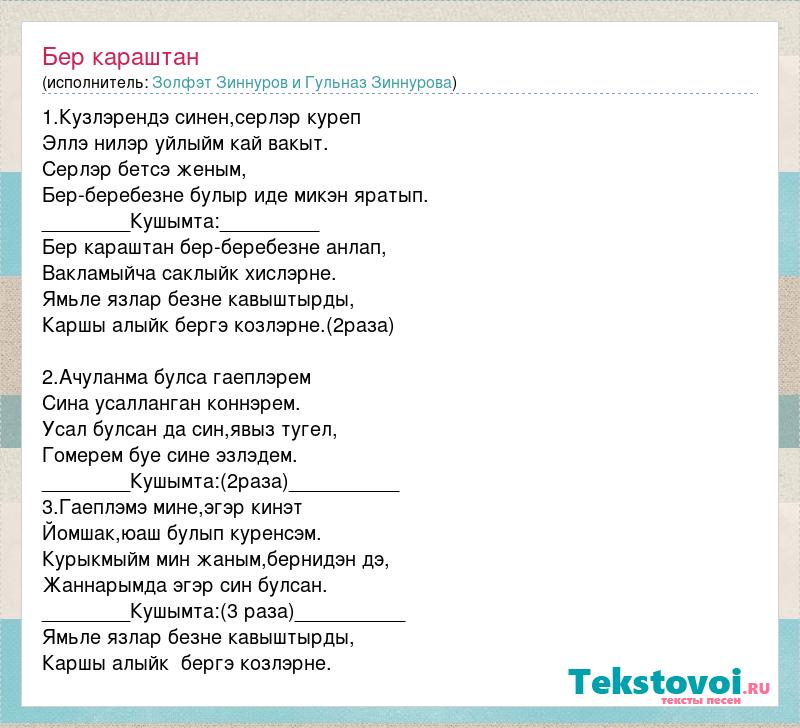 1.Кузлэрендэ синен,серлэр куреп Эллэ нилэр уйлыйм кай вакыт. Серлэр бетсэ женым, Бер-беребезне булыр иде микэн яратып. ________Кушымта:_________ Бер караштан бер-беребезне анлап, Вакламыйча саклыйк хислэрне. Ямьле язлар безне кавыштырды, Каршы алыйк бергэ козлэрне.(2раза) 2.Ачуланма булса гаеплэрем Сина усалланган коннэрем. Усал булсан да син,явыз тугел, Гомерем буе сине эзлэдем. ________Кушымта:(2раза)__________ 3.Гаеплэмэ мине,эгэр кинэт Йомшак,юаш булып куренсэм. Курыкмыйм мин жаным,бернидэн дэ, Жаннарымда эгэр син булсан. ________Кушымта:(3 раза)__________ Ямьле язлар безне кавыштырды, Каршы алыйк бергэ козлэрне.