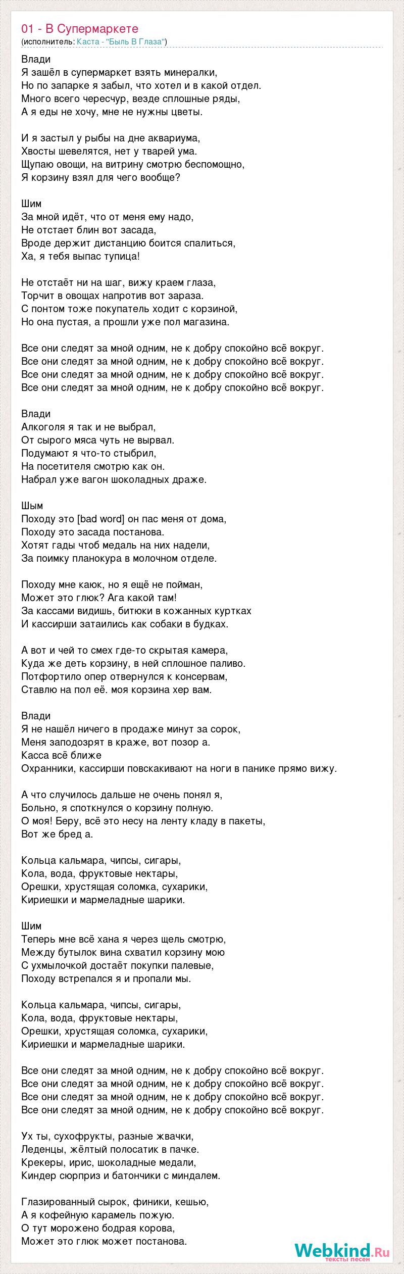 Влади Я зашёл в супермаркет взять минералки, Но по запарке я забыл, что хотел и в какой отдел. Много всего чересчур, везде сплошные ряды, А я еды не хочу, мне не нужны цветы. И я застыл у рыбы на дне аквариума, Хвосты шевелятся, нет у тварей ума. Щупаю овощи, на витрину смотрю беспомощно, Я корзину взял для чего вообще? Шим За мной идёт, что от меня ему надо, Не отстает блин вот засада, Вроде держит дистанцию боится спалиться, Ха, я тебя выпас тупица! Не отстаёт ни на шаг, вижу краем глаза, Торчит в овощах напротив вот зараза. С понтом тоже покупатель ходит с корзиной, Но она пустая, а прошли уже пол магазина. Все они следят за мной одним, не к добру спокойно всё вокруг. Все они следят за мной одним, не к добру спокойно всё вокруг. Все они следят за мной одним, не к добру спокойно всё вокруг. Все они следят за мной одним, не к добру спокойно всё вокруг. Влади Алкоголя я так и не выбрал, От сырого мяса чуть не вырвал. Подумают я что-то стыбрил, На посетителя смотрю как он. Набрал уже вагон шоколадных драже. Шым Походу это [bad word] он пас меня от дома, Походу это засада постанова. Хотят гады чтоб медаль на них надели, За поимку планокура в молочном отделе. Походу мне каюк, но я ещё не пойман, Может это глюк? Ага какой там! За кассами видишь, битюки в кожанных куртках И кассирши затаились как собаки в будках. А вот и чей то смех где-то скрытая камера, Куда же деть корзину, в ней сплошное паливо. Потфортило опер отвернулся к консервам, Ставлю на пол её. моя корзина хер вам. Влади Я не нашёл ничего в продаже минут за сорок, Меня заподозрят в краже, вот позор а. Касса всё ближе Охранники, кассирши повскакивают на ноги в панике прямо вижу. А что случилось дальше не очень понял я, Больно, я споткнулся о корзину полную. О моя! Беру, всё это несу на ленту кладу в пакеты, Вот же бред а. Кольца кальмара, чипсы, сигары, Кола, вода, фруктовые нектары, Орешки, хрустящая соломка, сухарики, Кириешки и мармеладные шарики. Шим Теперь мне всё хана я через щель смотрю, Между бутылок вина схватил корзину мою С ухмылочкой достаёт покупки палевые, Походу встрепался я и пропали мы. Кольца кальмара, чипсы, сигары, Кола, вода, фруктовые нектары, Орешки, хрустящая соломка, сухарики, Кириешки и мармеладные шарики. Все они следят за мной одним, не к добру спокойно всё вокруг. Все они следят за мной одним, не к добру спокойно всё вокруг. Все они следят за мной одним, не к добру спокойно всё вокруг. Все они следят за мной одним, не к добру спокойно всё вокруг. Ух ты, сухофрукты, разные жвачки, Леденцы, жёлтый полосатик в пачке. Крекеры, ирис, шоколадные медали, Киндер сюрприз и батончики с миндалем. Глазированный сырок, финики, кешью, А я кофейную карамель пожую. О тут морожено бодрая корова, Может это глюк может постанова.