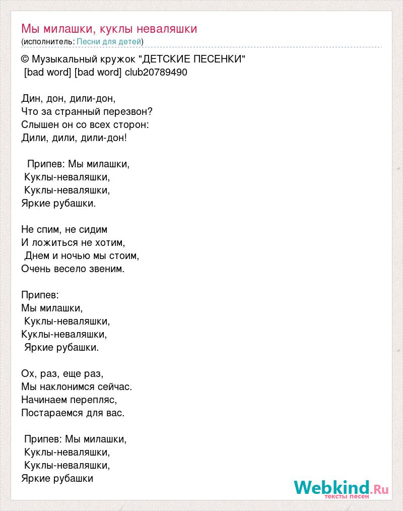 © Музыкальный кружок "ДЕТСКИЕ ПЕСЕНКИ" [bad word] [bad word] club20789490 Дин, дон, дили-дон, Что за странный перезвон? Слышен он со всех сторон: Дили, дили, дили-дон! Припев: Мы милашки, Куклы-неваляшки, Куклы-неваляшки, Яркие рубашки. Не спим, не сидим И ложиться не хотим, Днем и ночью мы стоим, Очень весело звеним. Припев: Мы милашки, Куклы-неваляшки, Куклы-неваляшки, Яркие рубашки. Ох, раз, еще раз, Мы наклонимся сейчас. Начинаем перепляс, Постараемся для вас. Припев: Мы милашки, Куклы-неваляшки, Куклы-неваляшки, Яркие рубашки