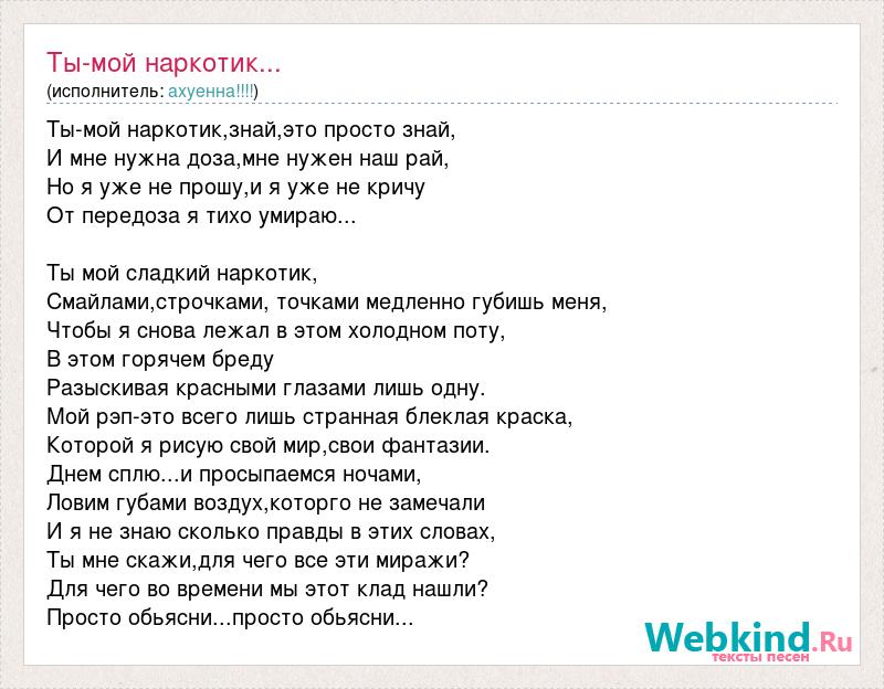 Ты-мой наркотик,знай,это просто знай, И мне нужна доза,мне нужен наш рай, Но я уже не прошу,и я уже не кричу От передоза я тихо умираю... Ты мой сладкий наркотик, Смайлами,строчками, точками медленно губишь меня, Чтобы я снова лежал в этом холодном поту, В этом горячем бреду Разыскивая красными глазами лишь одну. Мой рэп-это всего лишь странная блеклая краска, Которой я рисую свой мир,свои фантазии. Днем сплю...и просыпаемся ночами, Ловим губами воздух,которго не замечали И я не знаю сколько правды в этих словах, Ты мне скажи,для чего все эти миражи? Для чего во времени мы этот клад нашли? Просто обьясни...просто обьясни...