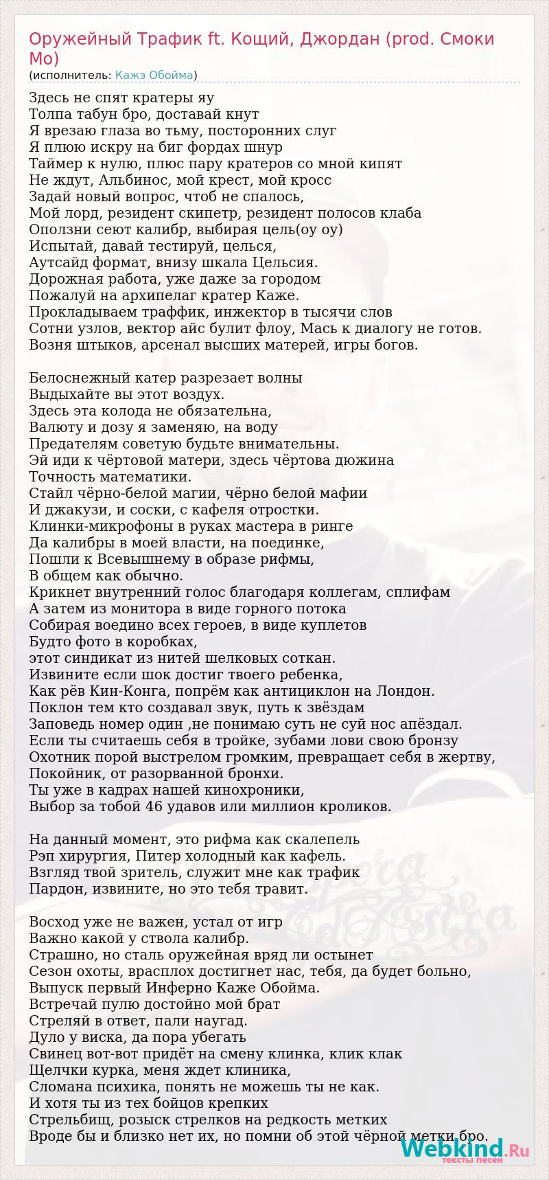 Здесь не спят кратеры яу Толпа табун бро, доставай кнут Я врезаю глаза во тьму, посторонних слуг Я плюю искру на биг фордах шнур Таймер к нулю, плюс пару кратеров со мной кипят Не ждут, Альбинос, мой крест, мой кросс Задай новый вопрос, чтоб не спалось, Мой лорд, резидент скипетр, резидент полосов клаба Оползни сеют калибр, выбирая цель(оу оу) Испытай, давай тестируй, целься, Аутсайд формат, внизу шкала Цельсия. Дорожная работа, уже даже за городом Пожалуй на архипелаг кратер Каже. Прокладываем траффик, инжектор в тысячи слов Сотни узлов, вектор айс булит флоу, Мась к диалогу не готов. Возня штыков, арсенал высших матерей, игры богов. Белоснежный катер разрезает волны Выдыхайте вы этот воздух. Здесь эта колода не обязательна, Валюту и дозу я заменяю, на воду Предателям советую будьте внимательны. Эй иди к чёртовой матери, здесь чёртова дюжина Точность математики. Стайл чёрно-белой магии, чёрно белой мафии И джакузи, и соски, с кафеля отростки. Клинки-микрофоны в руках мастера в ринге Да калибры в моей власти, на поединке, Пошли к Всевышнему в образе рифмы, В общем как обычно. Крикнет внутренний голос благодаря коллегам, сплифам А затем из монитора в виде горного потока Собирая воедино всех героев, в виде куплетов Будто фото в коробках, этот синдикат из нитей шелковых соткан. Извините если шок достиг твоего ребенка, Как рёв Кин-Конга, попрём как антициклон на Лондон. Поклон тем кто создавал звук, путь к звёздам Заповедь номер один ,не понимаю суть не суй нос апёздал. Если ты считаешь себя в тройке, зубами лови свою бронзу Охотник порой выстрелом громким, превращает себя в жертву, Покойник, от разорванной бронхи. Ты уже в кадрах нашей кинохроники, Выбор за тобой 46 удавов или миллион кроликов. На данный момент, это рифма как скалепель Рэп хирургия, Питер холодный как кафель. Взгляд твой зритель, служит мне как трафик Пардон, извините, но это тебя травит. Восход уже не важен, устал от игр Важно какой у ствола калибр. Страшно, но сталь оружейная вряд ли остынет Сезон охоты, врасплох достигнет нас, тебя, да будет больно, Выпуск первый Инферно Каже Обойма. Встречай пулю достойно мой брат Стреляй в ответ, пали наугад. Дуло у виска, да пора убегать Свинец вот-вот придёт на смену клинка, клик клак Щелчки курка, меня ждет клиника, Сломана психика, понять не можешь ты не как. И хотя ты из тех бойцов крепких Стрельбищ, розыск стрелков на редкость метких Вроде бы и близко нет их, но помни об этой чёрной метки бро.