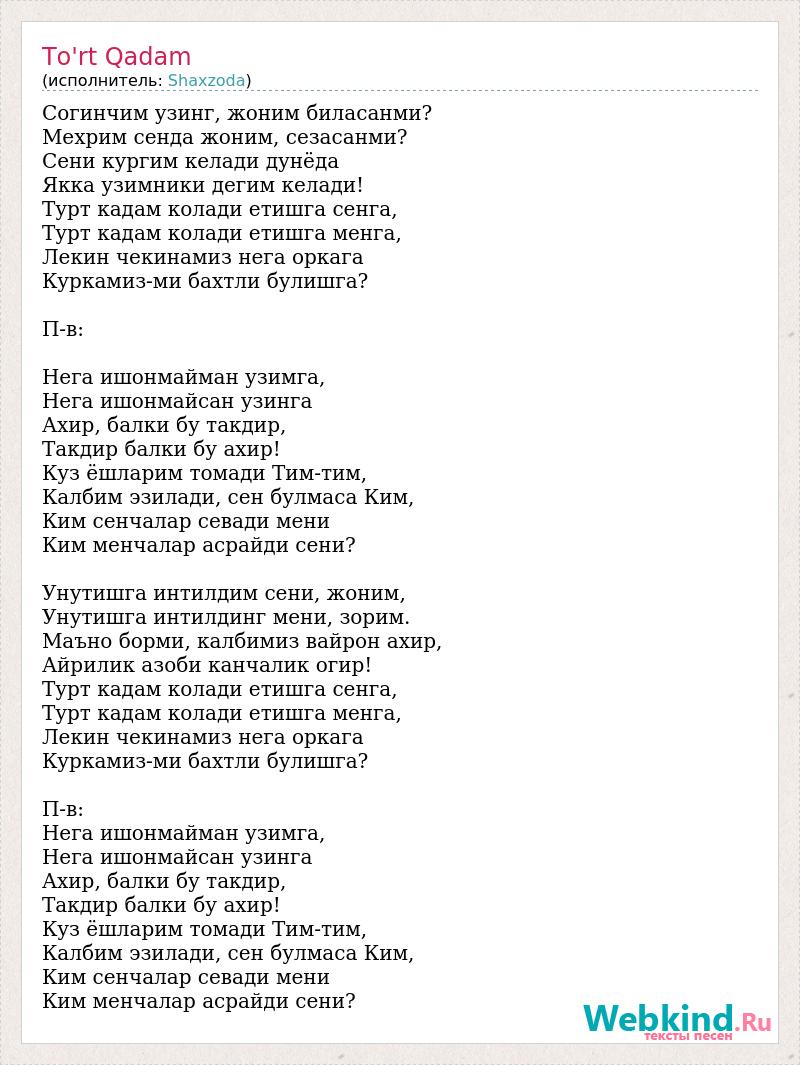 Согинчим узинг, жоним биласанми? Мехрим сенда жоним, сезасанми? Сени кургим келади дунёда Якка узимники дегим келади! Турт кадам колади етишга сенга, Турт кадам колади етишга менга, Лекин чекинамиз нега оркага Куркамиз-ми бахтли булишга? П-в: Нега ишонмайман узимга, Нега ишонмайсан узинга Ахир, балки бу такдир, Такдир балки бу ахир! Куз ёшларим томади Тим-тим, Калбим эзилади, сен булмаса Ким, Ким сенчалар севади мени Ким менчалар асрайди сени? Унутишга интилдим сени, жоним, Унутишга интилдинг мени, зорим. Маъно борми, калбимиз вайрон ахир, Айрилик азоби канчалик огир! Турт кадам колади етишга сенга, Турт кадам колади етишга менга, Лекин чекинамиз нега оркага Куркамиз-ми бахтли булишга? П-в: Нега ишонмайман узимга, Нега ишонмайсан узинга Ахир, балки бу такдир, Такдир балки бу ахир! Куз ёшларим томади Тим-тим, Калбим эзилади, сен булмаса Ким, Ким сенчалар севади мени Ким менчалар асрайди сени?