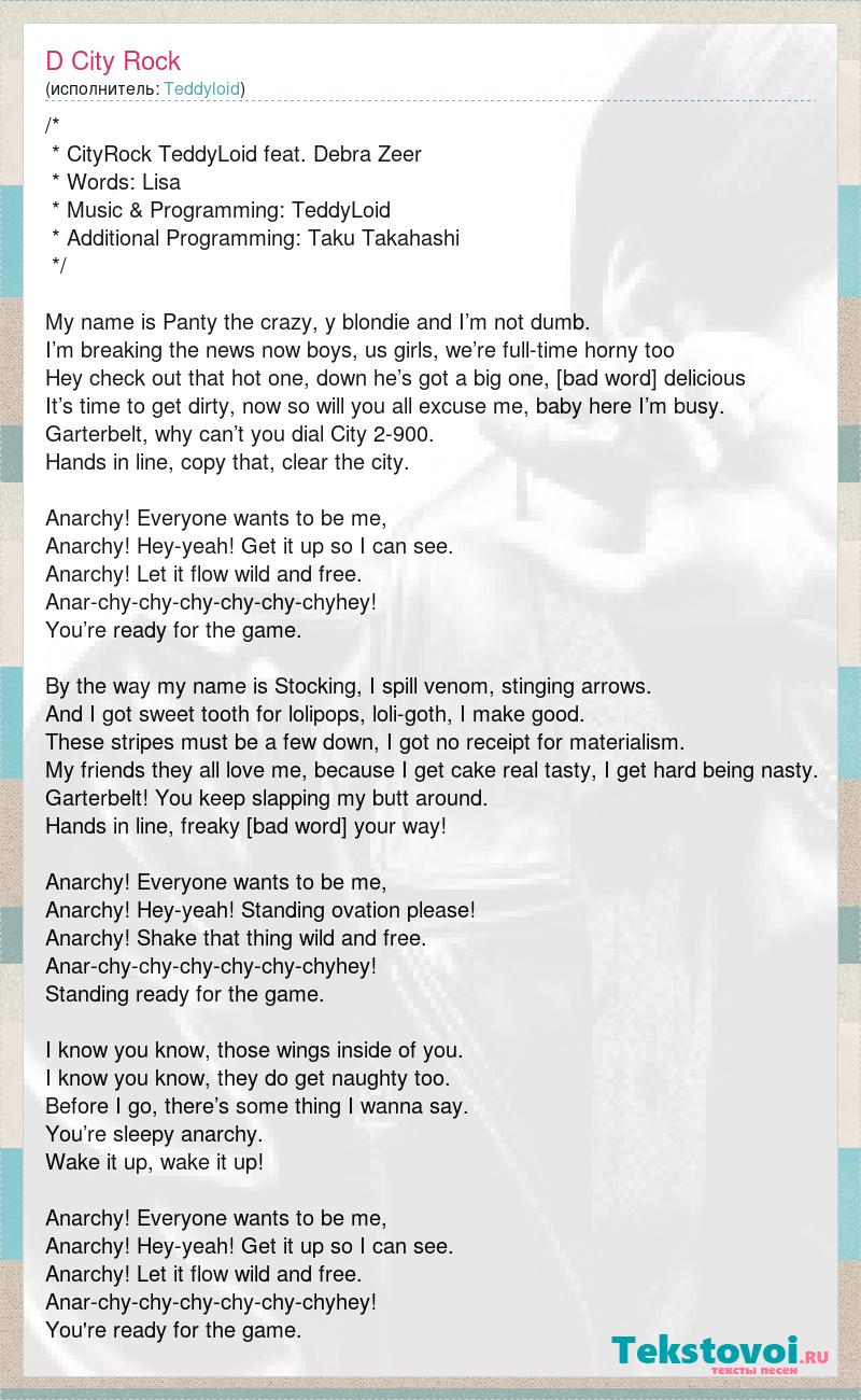 /* * CityRock TeddyLoid feat. Debra Zeer * Words: Lisa * Music & Programming: TeddyLoid * Additional Programming: Taku Takahashi */ My name is Panty the crazy, y blondie and I’m not dumb. I’m breaking the news now boys, us girls, we’re full-time horny too Hey check out that hot one, down he’s got a big one, [bad word] delicious It’s time to get dirty, now so will you all excuse me, baby here I’m busy. Garterbelt, why can’t you dial City 2-900. Hands in line, copy that, clear the city. Anarchy! Everyone wants to be me, Anarchy! Hey-yeah! Get it up so I can see. Anarchy! Let it flow wild and free. Anar-chy-chy-chy-chy-chy-chyhey! You’re ready for the game. By the way my name is Stocking, I spill venom, stinging arrows. And I got sweet tooth for lolipops, loli-goth, I make good. These stripes must be a few down, I got no receipt for materialism. My friends they all love me, because I get cake real tasty, I get hard being nasty. Garterbelt! You keep slapping my butt around. Hands in line, freaky girl coming your way! Anarchy! Everyone wants to be me, Anarchy! Hey-yeah! Standing ovation please! Anarchy! Shake that thing wild and free. Anar-chy-chy-chy-chy-chy-chyhey! Standing ready for the game. I know you know, those wings inside of you. I know you know, they do get naughty too. Before I go, there’s some thing I wanna say. You’re sleepy anarchy. Wake it up, wake it up! Anarchy! Everyone wants to be me, Anarchy! Hey-yeah! Get it up so I can see. Anarchy! Let it flow wild and free. Anar-chy-chy-chy-chy-chy-chyhey! You're ready for the game.