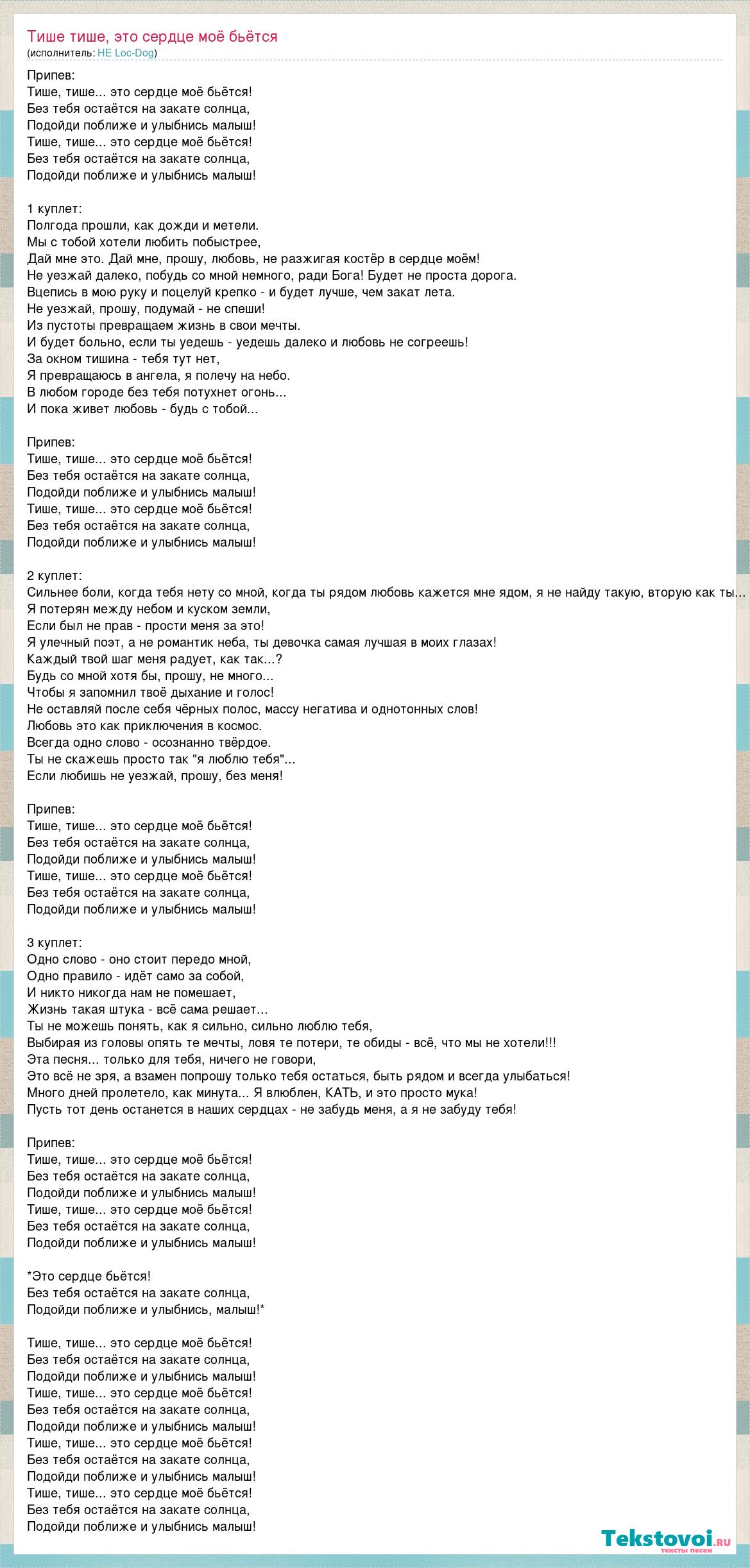 Припев: Тише, тише... это сердце моё бьётся! Без тебя остаётся на закате солнца, Подойди поближе и улыбнись малыш! Тише, тише... это сердце моё бьётся! Без тебя остаётся на закате солнца, Подойди поближе и улыбнись малыш! 1 куплет: Полгода прошли, как дожди и метели. Мы с тобой хотели любить побыстрее, Дай мне это. Дай мне, прошу, любовь, не разжигая костёр в сердце моём! Не уезжай далеко, побудь со мной немного, ради Бога! Будет не проста дорога. Вцепись в мою руку и поцелуй крепко - и будет лучше, чем закат лета. Не уезжай, прошу, подумай - не спеши! Из пустоты превращаем жизнь в свои мечты. И будет больно, если ты уедешь - уедешь далеко и любовь не согреешь! За окном тишина - тебя тут нет, Я превращаюсь в ангела, я полечу на небо. В любом городе без тебя потухнет огонь... И пока живет любовь - будь с тобой... Припев: Тише, тише... это сердце моё бьётся! Без тебя остаётся на закате солнца, Подойди поближе и улыбнись малыш! Тише, тише... это сердце моё бьётся! Без тебя остаётся на закате солнца, Подойди поближе и улыбнись малыш! 2 куплет: Сильнее боли, когда тебя нету со мной, когда ты рядом любовь кажется мне ядом, я не найду такую, вторую как ты... Я потерян между небом и куском земли, Если был не прав - прости меня за это! Я улечный поэт, а не романтик неба, ты девочка самая лучшая в моих глазах! Каждый твой шаг меня радует, как так...? Будь со мной хотя бы, прошу, не много... Чтобы я запомнил твоё дыхание и голос! Не оставляй после себя чёрных полос, массу негатива и однотонных слов! Любовь это как приключения в космос. Всегда одно слово - осознанно твёрдое. Ты не скажешь просто так "я люблю тебя"... Если любишь не уезжай, прошу, без меня! Припев: Тише, тише... это сердце моё бьётся! Без тебя остаётся на закате солнца, Подойди поближе и улыбнись малыш! Тише, тише... это сердце моё бьётся! Без тебя остаётся на закате солнца, Подойди поближе и улыбнись малыш! 3 куплет: Одно слово - оно стоит передо мной, Одно правило - идёт само за собой, И никто никогда нам не помешает, Жизнь такая штука - всё сама решает... Ты не можешь понять, как я сильно, сильно люблю тебя, Выбирая из головы опять те мечты, ловя те потери, те обиды - всё, что мы не хотели!!! Эта песня... только для тебя, ничего не говори, Это всё не зря, а взамен попрошу только тебя остаться, быть рядом и всегда улыбаться! Много дней пролетело, как минута... Я влюблен, КАТЬ, и это просто мука! Пусть тот день останется в наших сердцах - не забудь меня, а я не забуду тебя! Припев: Тише, тише... это сердце моё бьётся! Без тебя остаётся на закате солнца, Подойди поближе и улыбнись малыш! Тише, тише... это сердце моё бьётся! Без тебя остаётся на закате солнца, Подойди поближе и улыбнись малыш! *Это сердце бьётся! Без тебя остаётся на закате солнца, Подойди поближе и улыбнись, малыш!* Тише, тише... это сердце моё бьётся! Без тебя остаётся на закате солнца, Подойди поближе и улыбнись малыш! Тише, тише... это сердце моё бьётся! Без тебя остаётся на закате солнца, Подойди поближе и улыбнись малыш! Тише, тише... это сердце моё бьётся! Без тебя остаётся на закате солнца, Подойди поближе и улыбнись малыш! Тише, тише... это сердце моё бьётся! Без тебя остаётся на закате солнца, Подойди поближе и улыбнись малыш!