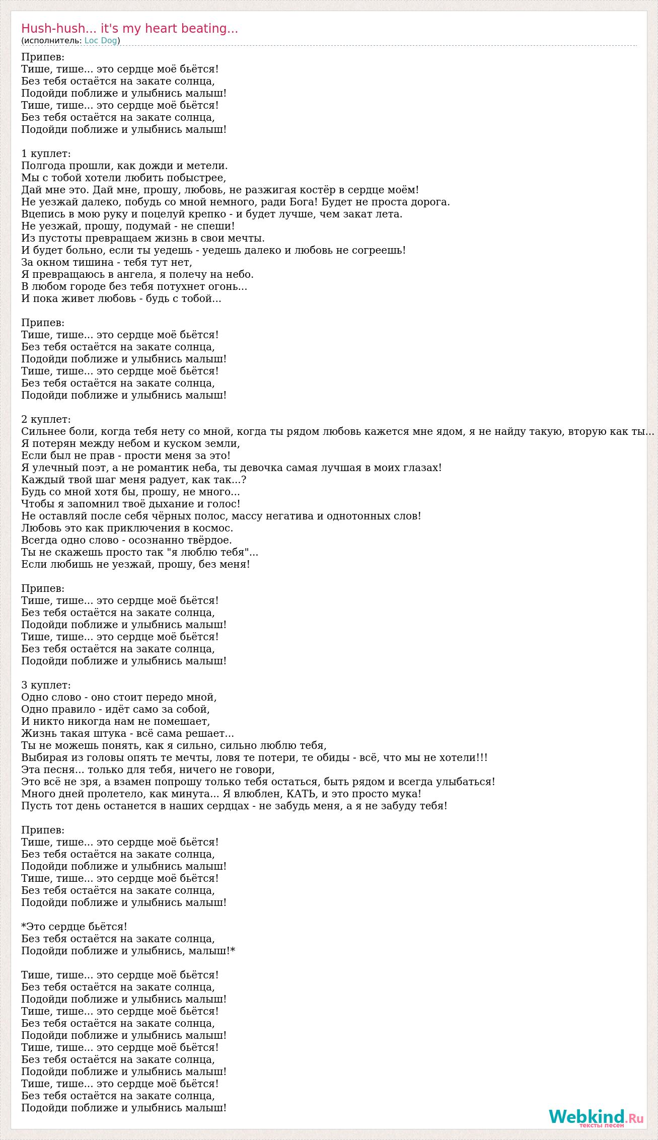 Припев: Тише, тише... это сердце моё бьётся! Без тебя остаётся на закате солнца, Подойди поближе и улыбнись малыш! Тише, тише... это сердце моё бьётся! Без тебя остаётся на закате солнца, Подойди поближе и улыбнись малыш! 1 куплет: Полгода прошли, как дожди и метели. Мы с тобой хотели любить побыстрее, Дай мне это. Дай мне, прошу, любовь, не разжигая костёр в сердце моём! Не уезжай далеко, побудь со мной немного, ради Бога! Будет не проста дорога. Вцепись в мою руку и поцелуй крепко - и будет лучше, чем закат лета. Не уезжай, прошу, подумай - не спеши! Из пустоты превращаем жизнь в свои мечты. И будет больно, если ты уедешь - уедешь далеко и любовь не согреешь! За окном тишина - тебя тут нет, Я превращаюсь в ангела, я полечу на небо. В любом городе без тебя потухнет огонь... И пока живет любовь - будь с тобой... Припев: Тише, тише... это сердце моё бьётся! Без тебя остаётся на закате солнца, Подойди поближе и улыбнись малыш! Тише, тише... это сердце моё бьётся! Без тебя остаётся на закате солнца, Подойди поближе и улыбнись малыш! 2 куплет: Сильнее боли, когда тебя нету со мной, когда ты рядом любовь кажется мне ядом, я не найду такую, вторую как ты... Я потерян между небом и куском земли, Если был не прав - прости меня за это! Я улечный поэт, а не романтик неба, ты девочка самая лучшая в моих глазах! Каждый твой шаг меня радует, как так...? Будь со мной хотя бы, прошу, не много... Чтобы я запомнил твоё дыхание и голос! Не оставляй после себя чёрных полос, массу негатива и однотонных слов! Любовь это как приключения в космос. Всегда одно слово - осознанно твёрдое. Ты не скажешь просто так "я люблю тебя"... Если любишь не уезжай, прошу, без меня! Припев: Тише, тише... это сердце моё бьётся! Без тебя остаётся на закате солнца, Подойди поближе и улыбнись малыш! Тише, тише... это сердце моё бьётся! Без тебя остаётся на закате солнца, Подойди поближе и улыбнись малыш! 3 куплет: Одно слово - оно стоит передо мной, Одно правило - идёт само за собой, И никто никогда нам не помешает, Жизнь такая штука - всё сама решает... Ты не можешь понять, как я сильно, сильно люблю тебя, Выбирая из головы опять те мечты, ловя те потери, те обиды - всё, что мы не хотели!!! Эта песня... только для тебя, ничего не говори, Это всё не зря, а взамен попрошу только тебя остаться, быть рядом и всегда улыбаться! Много дней пролетело, как минута... Я влюблен, КАТЬ, и это просто мука! Пусть тот день останется в наших сердцах - не забудь меня, а я не забуду тебя! Припев: Тише, тише... это сердце моё бьётся! Без тебя остаётся на закате солнца, Подойди поближе и улыбнись малыш! Тише, тише... это сердце моё бьётся! Без тебя остаётся на закате солнца, Подойди поближе и улыбнись малыш! *Это сердце бьётся! Без тебя остаётся на закате солнца, Подойди поближе и улыбнись, малыш!* Тише, тише... это сердце моё бьётся! Без тебя остаётся на закате солнца, Подойди поближе и улыбнись малыш! Тише, тише... это сердце моё бьётся! Без тебя остаётся на закате солнца, Подойди поближе и улыбнись малыш! Тише, тише... это сердце моё бьётся! Без тебя остаётся на закате солнца, Подойди поближе и улыбнись малыш! Тише, тише... это сердце моё бьётся! Без тебя остаётся на закате солнца, Подойди поближе и улыбнись малыш!