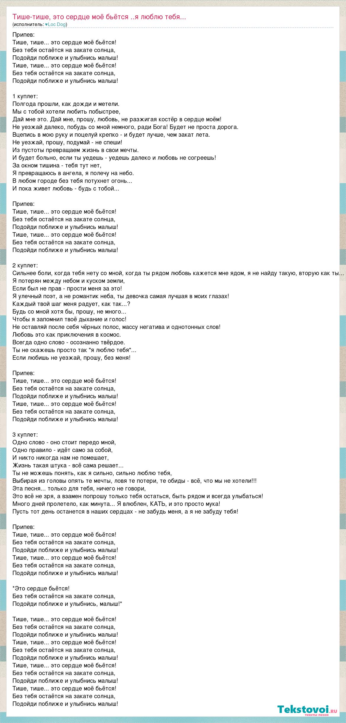Припев: Тише, тише... это сердце моё бьётся! Без тебя остаётся на закате солнца, Подойди поближе и улыбнись малыш! Тише, тише... это сердце моё бьётся! Без тебя остаётся на закате солнца, Подойди поближе и улыбнись малыш! 1 куплет: Полгода прошли, как дожди и метели. Мы с тобой хотели любить побыстрее, Дай мне это. Дай мне, прошу, любовь, не разжигая костёр в сердце моём! Не уезжай далеко, побудь со мной немного, ради Бога! Будет не проста дорога. Вцепись в мою руку и поцелуй крепко - и будет лучше, чем закат лета. Не уезжай, прошу, подумай - не спеши! Из пустоты превращаем жизнь в свои мечты. И будет больно, если ты уедешь - уедешь далеко и любовь не согреешь! За окном тишина - тебя тут нет, Я превращаюсь в ангела, я полечу на небо. В любом городе без тебя потухнет огонь... И пока живет любовь - будь с тобой... Припев: Тише, тише... это сердце моё бьётся! Без тебя остаётся на закате солнца, Подойди поближе и улыбнись малыш! Тише, тише... это сердце моё бьётся! Без тебя остаётся на закате солнца, Подойди поближе и улыбнись малыш! 2 куплет: Сильнее боли, когда тебя нету со мной, когда ты рядом любовь кажется мне ядом, я не найду такую, вторую как ты... Я потерян между небом и куском земли, Если был не прав - прости меня за это! Я улечный поэт, а не романтик неба, ты девочка самая лучшая в моих глазах! Каждый твой шаг меня радует, как так...? Будь со мной хотя бы, прошу, не много... Чтобы я запомнил твоё дыхание и голос! Не оставляй после себя чёрных полос, массу негатива и однотонных слов! Любовь это как приключения в космос. Всегда одно слово - осознанно твёрдое. Ты не скажешь просто так "я люблю тебя"... Если любишь не уезжай, прошу, без меня! Припев: Тише, тише... это сердце моё бьётся! Без тебя остаётся на закате солнца, Подойди поближе и улыбнись малыш! Тише, тише... это сердце моё бьётся! Без тебя остаётся на закате солнца, Подойди поближе и улыбнись малыш! 3 куплет: Одно слово - оно стоит передо мной, Одно правило - идёт само за собой, И никто никогда нам не помешает, Жизнь такая штука - всё сама решает... Ты не можешь понять, как я сильно, сильно люблю тебя, Выбирая из головы опять те мечты, ловя те потери, те обиды - всё, что мы не хотели!!! Эта песня... только для тебя, ничего не говори, Это всё не зря, а взамен попрошу только тебя остаться, быть рядом и всегда улыбаться! Много дней пролетело, как минута... Я влюблен, КАТЬ, и это просто мука! Пусть тот день останется в наших сердцах - не забудь меня, а я не забуду тебя! Припев: Тише, тише... это сердце моё бьётся! Без тебя остаётся на закате солнца, Подойди поближе и улыбнись малыш! Тише, тише... это сердце моё бьётся! Без тебя остаётся на закате солнца, Подойди поближе и улыбнись малыш! *Это сердце бьётся! Без тебя остаётся на закате солнца, Подойди поближе и улыбнись, малыш!* Тише, тише... это сердце моё бьётся! Без тебя остаётся на закате солнца, Подойди поближе и улыбнись малыш! Тише, тише... это сердце моё бьётся! Без тебя остаётся на закате солнца, Подойди поближе и улыбнись малыш! Тише, тише... это сердце моё бьётся! Без тебя остаётся на закате солнца, Подойди поближе и улыбнись малыш! Тише, тише... это сердце моё бьётся! Без тебя остаётся на закате солнца, Подойди поближе и улыбнись малыш!