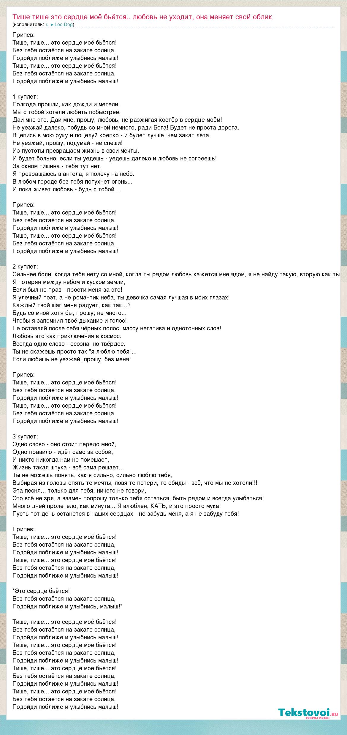 Припев: Тише, тише... это сердце моё бьётся! Без тебя остаётся на закате солнца, Подойди поближе и улыбнись малыш! Тише, тише... это сердце моё бьётся! Без тебя остаётся на закате солнца, Подойди поближе и улыбнись малыш! 1 куплет: Полгода прошли, как дожди и метели. Мы с тобой хотели любить побыстрее, Дай мне это. Дай мне, прошу, любовь, не разжигая костёр в сердце моём! Не уезжай далеко, побудь со мной немного, ради Бога! Будет не проста дорога. Вцепись в мою руку и поцелуй крепко - и будет лучше, чем закат лета. Не уезжай, прошу, подумай - не спеши! Из пустоты превращаем жизнь в свои мечты. И будет больно, если ты уедешь - уедешь далеко и любовь не согреешь! За окном тишина - тебя тут нет, Я превращаюсь в ангела, я полечу на небо. В любом городе без тебя потухнет огонь... И пока живет любовь - будь с тобой... Припев: Тише, тише... это сердце моё бьётся! Без тебя остаётся на закате солнца, Подойди поближе и улыбнись малыш! Тише, тише... это сердце моё бьётся! Без тебя остаётся на закате солнца, Подойди поближе и улыбнись малыш! 2 куплет: Сильнее боли, когда тебя нету со мной, когда ты рядом любовь кажется мне ядом, я не найду такую, вторую как ты... Я потерян между небом и куском земли, Если был не прав - прости меня за это! Я улечный поэт, а не романтик неба, ты девочка самая лучшая в моих глазах! Каждый твой шаг меня радует, как так...? Будь со мной хотя бы, прошу, не много... Чтобы я запомнил твоё дыхание и голос! Не оставляй после себя чёрных полос, массу негатива и однотонных слов! Любовь это как приключения в космос. Всегда одно слово - осознанно твёрдое. Ты не скажешь просто так "я люблю тебя"... Если любишь не уезжай, прошу, без меня! Припев: Тише, тише... это сердце моё бьётся! Без тебя остаётся на закате солнца, Подойди поближе и улыбнись малыш! Тише, тише... это сердце моё бьётся! Без тебя остаётся на закате солнца, Подойди поближе и улыбнись малыш! 3 куплет: Одно слово - оно стоит передо мной, Одно правило - идёт само за собой, И никто никогда нам не помешает, Жизнь такая штука - всё сама решает... Ты не можешь понять, как я сильно, сильно люблю тебя, Выбирая из головы опять те мечты, ловя те потери, те обиды - всё, что мы не хотели!!! Эта песня... только для тебя, ничего не говори, Это всё не зря, а взамен попрошу только тебя остаться, быть рядом и всегда улыбаться! Много дней пролетело, как минута... Я влюблен, КАТЬ, и это просто мука! Пусть тот день останется в наших сердцах - не забудь меня, а я не забуду тебя! Припев: Тише, тише... это сердце моё бьётся! Без тебя остаётся на закате солнца, Подойди поближе и улыбнись малыш! Тише, тише... это сердце моё бьётся! Без тебя остаётся на закате солнца, Подойди поближе и улыбнись малыш! *Это сердце бьётся! Без тебя остаётся на закате солнца, Подойди поближе и улыбнись, малыш!* Тише, тише... это сердце моё бьётся! Без тебя остаётся на закате солнца, Подойди поближе и улыбнись малыш! Тише, тише... это сердце моё бьётся! Без тебя остаётся на закате солнца, Подойди поближе и улыбнись малыш! Тише, тише... это сердце моё бьётся! Без тебя остаётся на закате солнца, Подойди поближе и улыбнись малыш! Тише, тише... это сердце моё бьётся! Без тебя остаётся на закате солнца, Подойди поближе и улыбнись малыш!