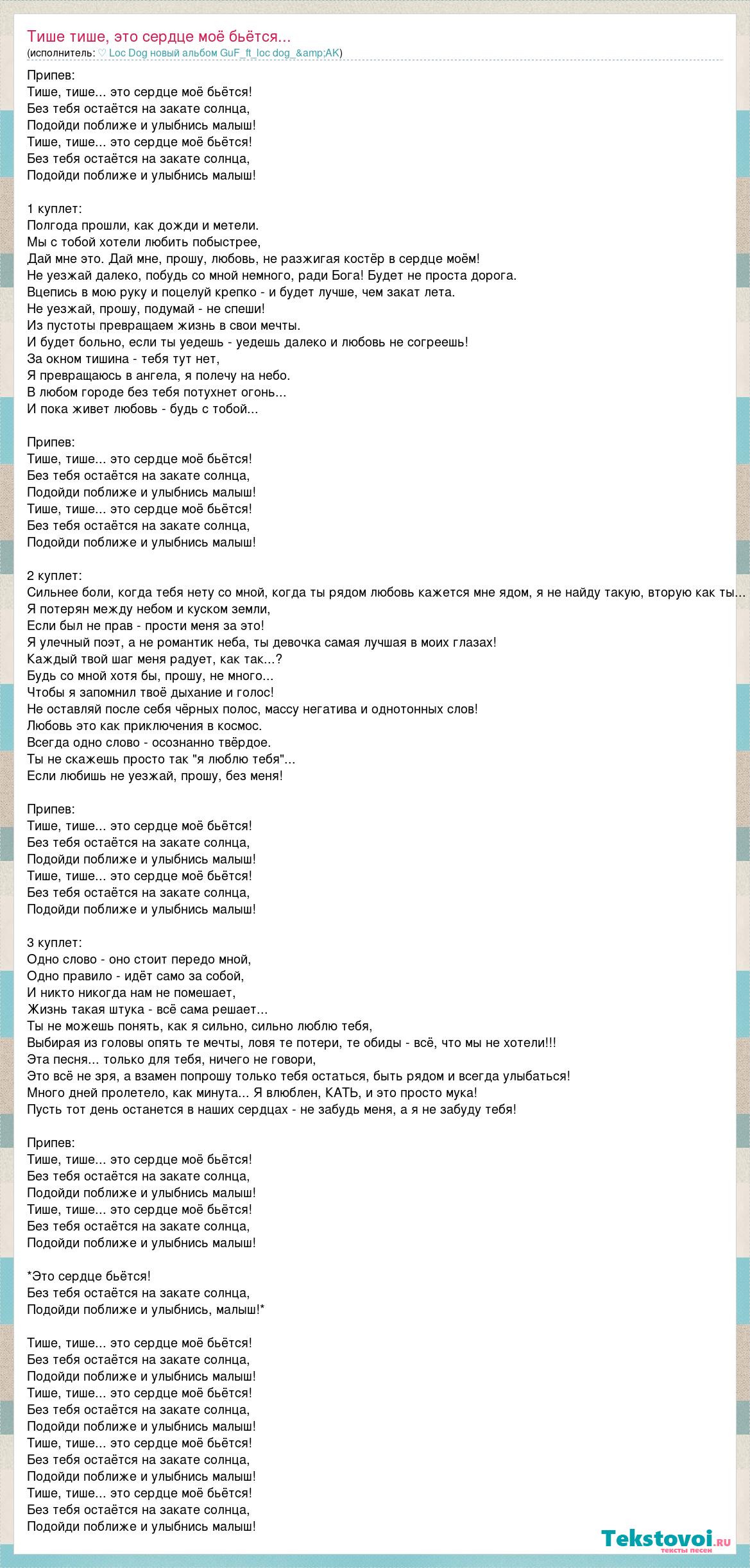 Припев: Тише, тише... это сердце моё бьётся! Без тебя остаётся на закате солнца, Подойди поближе и улыбнись малыш! Тише, тише... это сердце моё бьётся! Без тебя остаётся на закате солнца, Подойди поближе и улыбнись малыш! 1 куплет: Полгода прошли, как дожди и метели. Мы с тобой хотели любить побыстрее, Дай мне это. Дай мне, прошу, любовь, не разжигая костёр в сердце моём! Не уезжай далеко, побудь со мной немного, ради Бога! Будет не проста дорога. Вцепись в мою руку и поцелуй крепко - и будет лучше, чем закат лета. Не уезжай, прошу, подумай - не спеши! Из пустоты превращаем жизнь в свои мечты. И будет больно, если ты уедешь - уедешь далеко и любовь не согреешь! За окном тишина - тебя тут нет, Я превращаюсь в ангела, я полечу на небо. В любом городе без тебя потухнет огонь... И пока живет любовь - будь с тобой... Припев: Тише, тише... это сердце моё бьётся! Без тебя остаётся на закате солнца, Подойди поближе и улыбнись малыш! Тише, тише... это сердце моё бьётся! Без тебя остаётся на закате солнца, Подойди поближе и улыбнись малыш! 2 куплет: Сильнее боли, когда тебя нету со мной, когда ты рядом любовь кажется мне ядом, я не найду такую, вторую как ты... Я потерян между небом и куском земли, Если был не прав - прости меня за это! Я улечный поэт, а не романтик неба, ты девочка самая лучшая в моих глазах! Каждый твой шаг меня радует, как так...? Будь со мной хотя бы, прошу, не много... Чтобы я запомнил твоё дыхание и голос! Не оставляй после себя чёрных полос, массу негатива и однотонных слов! Любовь это как приключения в космос. Всегда одно слово - осознанно твёрдое. Ты не скажешь просто так "я люблю тебя"... Если любишь не уезжай, прошу, без меня! Припев: Тише, тише... это сердце моё бьётся! Без тебя остаётся на закате солнца, Подойди поближе и улыбнись малыш! Тише, тише... это сердце моё бьётся! Без тебя остаётся на закате солнца, Подойди поближе и улыбнись малыш! 3 куплет: Одно слово - оно стоит передо мной, Одно правило - идёт само за собой, И никто никогда нам не помешает, Жизнь такая штука - всё сама решает... Ты не можешь понять, как я сильно, сильно люблю тебя, Выбирая из головы опять те мечты, ловя те потери, те обиды - всё, что мы не хотели!!! Эта песня... только для тебя, ничего не говори, Это всё не зря, а взамен попрошу только тебя остаться, быть рядом и всегда улыбаться! Много дней пролетело, как минута... Я влюблен, КАТЬ, и это просто мука! Пусть тот день останется в наших сердцах - не забудь меня, а я не забуду тебя! Припев: Тише, тише... это сердце моё бьётся! Без тебя остаётся на закате солнца, Подойди поближе и улыбнись малыш! Тише, тише... это сердце моё бьётся! Без тебя остаётся на закате солнца, Подойди поближе и улыбнись малыш! *Это сердце бьётся! Без тебя остаётся на закате солнца, Подойди поближе и улыбнись, малыш!* Тише, тише... это сердце моё бьётся! Без тебя остаётся на закате солнца, Подойди поближе и улыбнись малыш! Тише, тише... это сердце моё бьётся! Без тебя остаётся на закате солнца, Подойди поближе и улыбнись малыш! Тише, тише... это сердце моё бьётся! Без тебя остаётся на закате солнца, Подойди поближе и улыбнись малыш! Тише, тише... это сердце моё бьётся! Без тебя остаётся на закате солнца, Подойди поближе и улыбнись малыш!