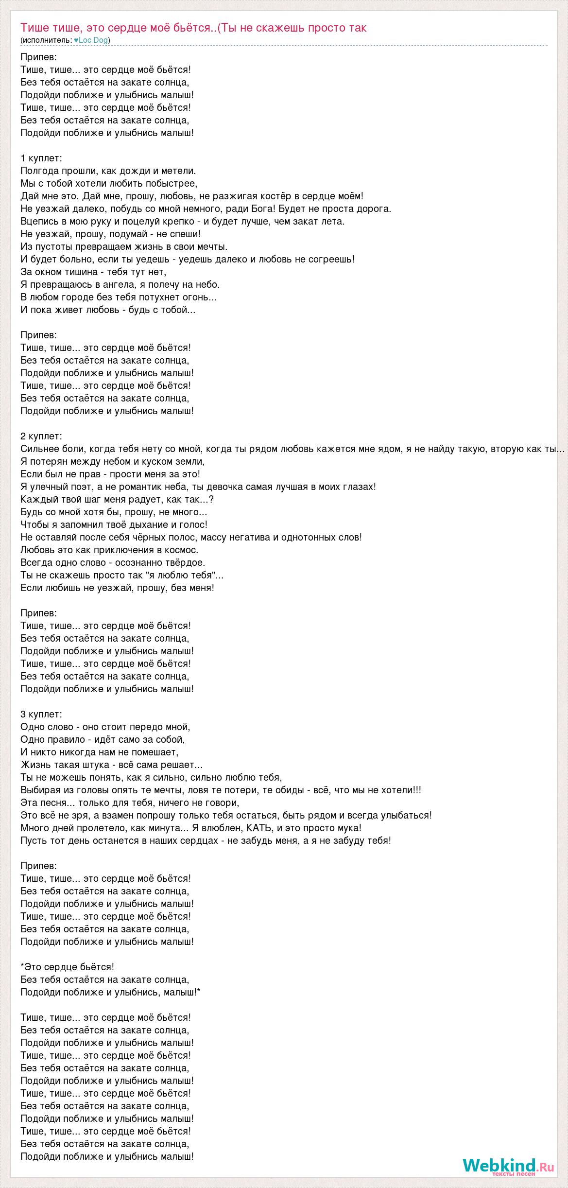 Припев: Тише, тише... это сердце моё бьётся! Без тебя остаётся на закате солнца, Подойди поближе и улыбнись малыш! Тише, тише... это сердце моё бьётся! Без тебя остаётся на закате солнца, Подойди поближе и улыбнись малыш! 1 куплет: Полгода прошли, как дожди и метели. Мы с тобой хотели любить побыстрее, Дай мне это. Дай мне, прошу, любовь, не разжигая костёр в сердце моём! Не уезжай далеко, побудь со мной немного, ради Бога! Будет не проста дорога. Вцепись в мою руку и поцелуй крепко - и будет лучше, чем закат лета. Не уезжай, прошу, подумай - не спеши! Из пустоты превращаем жизнь в свои мечты. И будет больно, если ты уедешь - уедешь далеко и любовь не согреешь! За окном тишина - тебя тут нет, Я превращаюсь в ангела, я полечу на небо. В любом городе без тебя потухнет огонь... И пока живет любовь - будь с тобой... Припев: Тише, тише... это сердце моё бьётся! Без тебя остаётся на закате солнца, Подойди поближе и улыбнись малыш! Тише, тише... это сердце моё бьётся! Без тебя остаётся на закате солнца, Подойди поближе и улыбнись малыш! 2 куплет: Сильнее боли, когда тебя нету со мной, когда ты рядом любовь кажется мне ядом, я не найду такую, вторую как ты... Я потерян между небом и куском земли, Если был не прав - прости меня за это! Я улечный поэт, а не романтик неба, ты девочка самая лучшая в моих глазах! Каждый твой шаг меня радует, как так...? Будь со мной хотя бы, прошу, не много... Чтобы я запомнил твоё дыхание и голос! Не оставляй после себя чёрных полос, массу негатива и однотонных слов! Любовь это как приключения в космос. Всегда одно слово - осознанно твёрдое. Ты не скажешь просто так "я люблю тебя"... Если любишь не уезжай, прошу, без меня! Припев: Тише, тише... это сердце моё бьётся! Без тебя остаётся на закате солнца, Подойди поближе и улыбнись малыш! Тише, тише... это сердце моё бьётся! Без тебя остаётся на закате солнца, Подойди поближе и улыбнись малыш! 3 куплет: Одно слово - оно стоит передо мной, Одно правило - идёт само за собой, И никто никогда нам не помешает, Жизнь такая штука - всё сама решает... Ты не можешь понять, как я сильно, сильно люблю тебя, Выбирая из головы опять те мечты, ловя те потери, те обиды - всё, что мы не хотели!!! Эта песня... только для тебя, ничего не говори, Это всё не зря, а взамен попрошу только тебя остаться, быть рядом и всегда улыбаться! Много дней пролетело, как минута... Я влюблен, КАТЬ, и это просто мука! Пусть тот день останется в наших сердцах - не забудь меня, а я не забуду тебя! Припев: Тише, тише... это сердце моё бьётся! Без тебя остаётся на закате солнца, Подойди поближе и улыбнись малыш! Тише, тише... это сердце моё бьётся! Без тебя остаётся на закате солнца, Подойди поближе и улыбнись малыш! *Это сердце бьётся! Без тебя остаётся на закате солнца, Подойди поближе и улыбнись, малыш!* Тише, тише... это сердце моё бьётся! Без тебя остаётся на закате солнца, Подойди поближе и улыбнись малыш! Тише, тише... это сердце моё бьётся! Без тебя остаётся на закате солнца, Подойди поближе и улыбнись малыш! Тише, тише... это сердце моё бьётся! Без тебя остаётся на закате солнца, Подойди поближе и улыбнись малыш! Тише, тише... это сердце моё бьётся! Без тебя остаётся на закате солнца, Подойди поближе и улыбнись малыш!