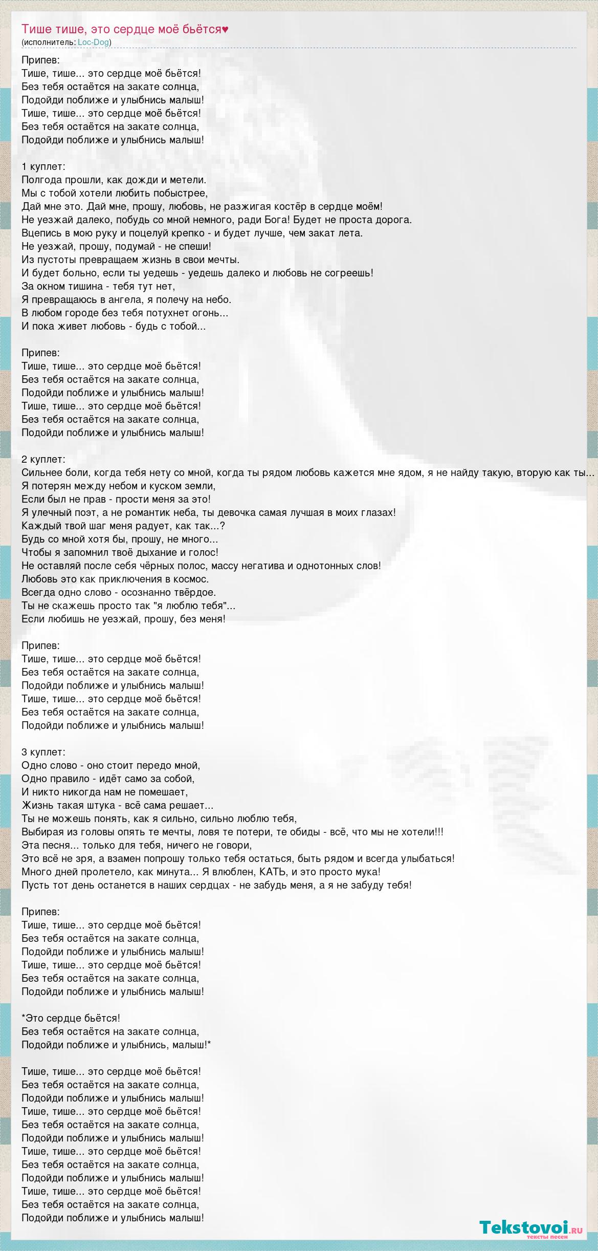 Припев: Тише, тише... это сердце моё бьётся! Без тебя остаётся на закате солнца, Подойди поближе и улыбнись малыш! Тише, тише... это сердце моё бьётся! Без тебя остаётся на закате солнца, Подойди поближе и улыбнись малыш! 1 куплет: Полгода прошли, как дожди и метели. Мы с тобой хотели любить побыстрее, Дай мне это. Дай мне, прошу, любовь, не разжигая костёр в сердце моём! Не уезжай далеко, побудь со мной немного, ради Бога! Будет не проста дорога. Вцепись в мою руку и поцелуй крепко - и будет лучше, чем закат лета. Не уезжай, прошу, подумай - не спеши! Из пустоты превращаем жизнь в свои мечты. И будет больно, если ты уедешь - уедешь далеко и любовь не согреешь! За окном тишина - тебя тут нет, Я превращаюсь в ангела, я полечу на небо. В любом городе без тебя потухнет огонь... И пока живет любовь - будь с тобой... Припев: Тише, тише... это сердце моё бьётся! Без тебя остаётся на закате солнца, Подойди поближе и улыбнись малыш! Тише, тише... это сердце моё бьётся! Без тебя остаётся на закате солнца, Подойди поближе и улыбнись малыш! 2 куплет: Сильнее боли, когда тебя нету со мной, когда ты рядом любовь кажется мне ядом, я не найду такую, вторую как ты... Я потерян между небом и куском земли, Если был не прав - прости меня за это! Я улечный поэт, а не романтик неба, ты девочка самая лучшая в моих глазах! Каждый твой шаг меня радует, как так...? Будь со мной хотя бы, прошу, не много... Чтобы я запомнил твоё дыхание и голос! Не оставляй после себя чёрных полос, массу негатива и однотонных слов! Любовь это как приключения в космос. Всегда одно слово - осознанно твёрдое. Ты не скажешь просто так "я люблю тебя"... Если любишь не уезжай, прошу, без меня! Припев: Тише, тише... это сердце моё бьётся! Без тебя остаётся на закате солнца, Подойди поближе и улыбнись малыш! Тише, тише... это сердце моё бьётся! Без тебя остаётся на закате солнца, Подойди поближе и улыбнись малыш! 3 куплет: Одно слово - оно стоит передо мной, Одно правило - идёт само за собой, И никто никогда нам не помешает, Жизнь такая штука - всё сама решает... Ты не можешь понять, как я сильно, сильно люблю тебя, Выбирая из головы опять те мечты, ловя те потери, те обиды - всё, что мы не хотели!!! Эта песня... только для тебя, ничего не говори, Это всё не зря, а взамен попрошу только тебя остаться, быть рядом и всегда улыбаться! Много дней пролетело, как минута... Я влюблен, КАТЬ, и это просто мука! Пусть тот день останется в наших сердцах - не забудь меня, а я не забуду тебя! Припев: Тише, тише... это сердце моё бьётся! Без тебя остаётся на закате солнца, Подойди поближе и улыбнись малыш! Тише, тише... это сердце моё бьётся! Без тебя остаётся на закате солнца, Подойди поближе и улыбнись малыш! *Это сердце бьётся! Без тебя остаётся на закате солнца, Подойди поближе и улыбнись, малыш!* Тише, тише... это сердце моё бьётся! Без тебя остаётся на закате солнца, Подойди поближе и улыбнись малыш! Тише, тише... это сердце моё бьётся! Без тебя остаётся на закате солнца, Подойди поближе и улыбнись малыш! Тише, тише... это сердце моё бьётся! Без тебя остаётся на закате солнца, Подойди поближе и улыбнись малыш! Тише, тише... это сердце моё бьётся! Без тебя остаётся на закате солнца, Подойди поближе и улыбнись малыш!