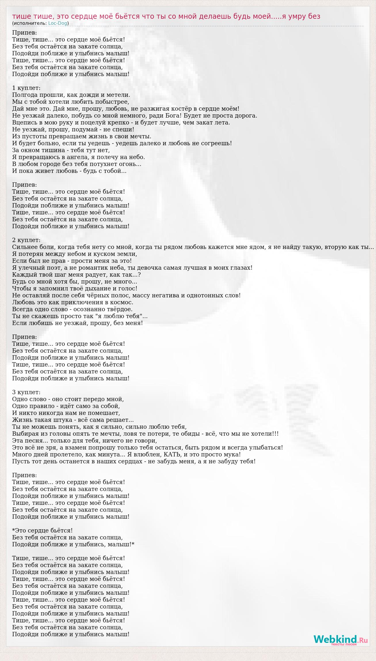 Припев: Тише, тише... это сердце моё бьётся! Без тебя остаётся на закате солнца, Подойди поближе и улыбнись малыш! Тише, тише... это сердце моё бьётся! Без тебя остаётся на закате солнца, Подойди поближе и улыбнись малыш! 1 куплет: Полгода прошли, как дожди и метели. Мы с тобой хотели любить побыстрее, Дай мне это. Дай мне, прошу, любовь, не разжигая костёр в сердце моём! Не уезжай далеко, побудь со мной немного, ради Бога! Будет не проста дорога. Вцепись в мою руку и поцелуй крепко - и будет лучше, чем закат лета. Не уезжай, прошу, подумай - не спеши! Из пустоты превращаем жизнь в свои мечты. И будет больно, если ты уедешь - уедешь далеко и любовь не согреешь! За окном тишина - тебя тут нет, Я превращаюсь в ангела, я полечу на небо. В любом городе без тебя потухнет огонь... И пока живет любовь - будь с тобой... Припев: Тише, тише... это сердце моё бьётся! Без тебя остаётся на закате солнца, Подойди поближе и улыбнись малыш! Тише, тише... это сердце моё бьётся! Без тебя остаётся на закате солнца, Подойди поближе и улыбнись малыш! 2 куплет: Сильнее боли, когда тебя нету со мной, когда ты рядом любовь кажется мне ядом, я не найду такую, вторую как ты... Я потерян между небом и куском земли, Если был не прав - прости меня за это! Я улечный поэт, а не романтик неба, ты девочка самая лучшая в моих глазах! Каждый твой шаг меня радует, как так...? Будь со мной хотя бы, прошу, не много... Чтобы я запомнил твоё дыхание и голос! Не оставляй после себя чёрных полос, массу негатива и однотонных слов! Любовь это как приключения в космос. Всегда одно слово - осознанно твёрдое. Ты не скажешь просто так "я люблю тебя"... Если любишь не уезжай, прошу, без меня! Припев: Тише, тише... это сердце моё бьётся! Без тебя остаётся на закате солнца, Подойди поближе и улыбнись малыш! Тише, тише... это сердце моё бьётся! Без тебя остаётся на закате солнца, Подойди поближе и улыбнись малыш! 3 куплет: Одно слово - оно стоит передо мной, Одно правило - идёт само за собой, И никто никогда нам не помешает, Жизнь такая штука - всё сама решает... Ты не можешь понять, как я сильно, сильно люблю тебя, Выбирая из головы опять те мечты, ловя те потери, те обиды - всё, что мы не хотели!!! Эта песня... только для тебя, ничего не говори, Это всё не зря, а взамен попрошу только тебя остаться, быть рядом и всегда улыбаться! Много дней пролетело, как минута... Я влюблен, КАТЬ, и это просто мука! Пусть тот день останется в наших сердцах - не забудь меня, а я не забуду тебя! Припев: Тише, тише... это сердце моё бьётся! Без тебя остаётся на закате солнца, Подойди поближе и улыбнись малыш! Тише, тише... это сердце моё бьётся! Без тебя остаётся на закате солнца, Подойди поближе и улыбнись малыш! *Это сердце бьётся! Без тебя остаётся на закате солнца, Подойди поближе и улыбнись, малыш!* Тише, тише... это сердце моё бьётся! Без тебя остаётся на закате солнца, Подойди поближе и улыбнись малыш! Тише, тише... это сердце моё бьётся! Без тебя остаётся на закате солнца, Подойди поближе и улыбнись малыш! Тише, тише... это сердце моё бьётся! Без тебя остаётся на закате солнца, Подойди поближе и улыбнись малыш! Тише, тише... это сердце моё бьётся! Без тебя остаётся на закате солнца, Подойди поближе и улыбнись малыш!