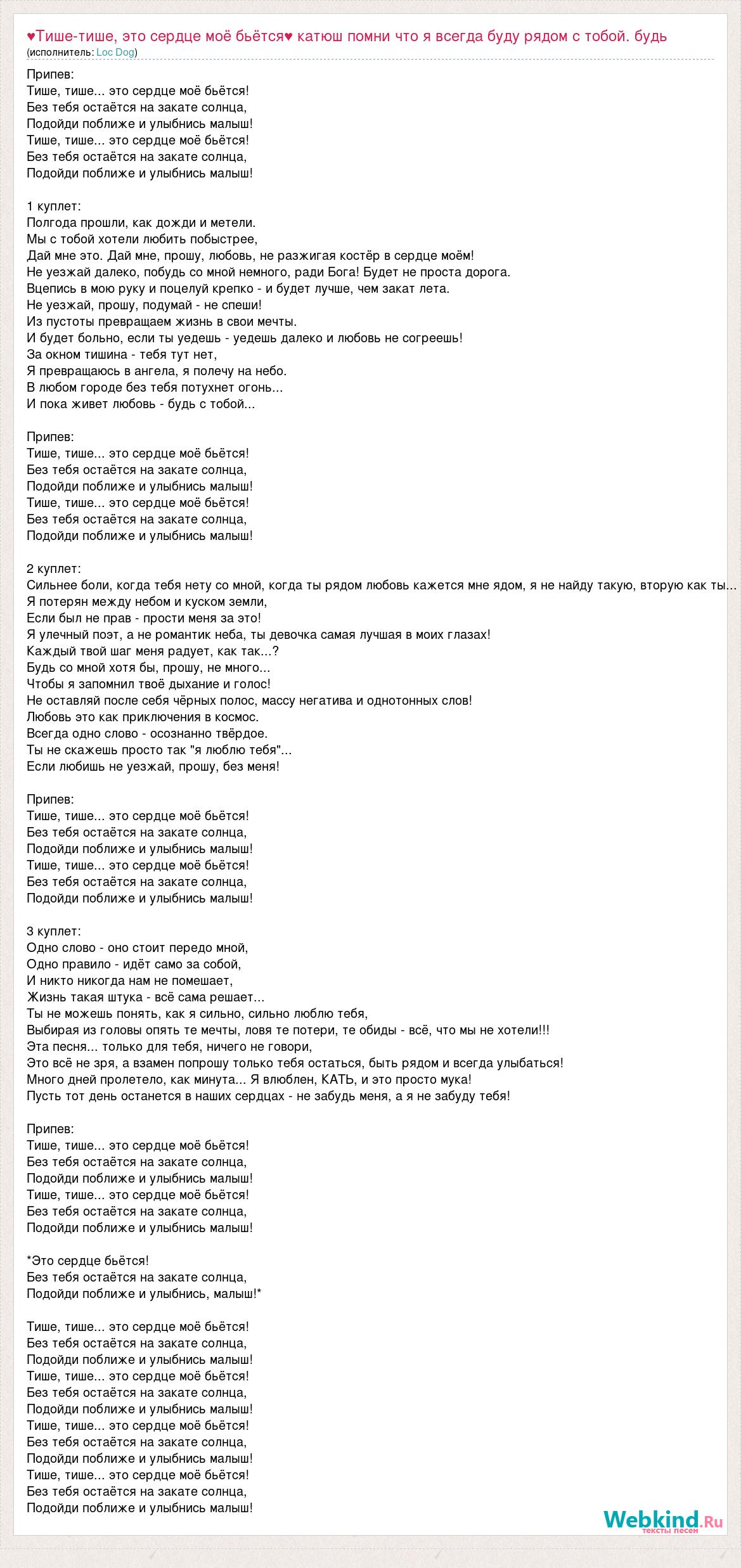 Припев: Тише, тише... это сердце моё бьётся! Без тебя остаётся на закате солнца, Подойди поближе и улыбнись малыш! Тише, тише... это сердце моё бьётся! Без тебя остаётся на закате солнца, Подойди поближе и улыбнись малыш! 1 куплет: Полгода прошли, как дожди и метели. Мы с тобой хотели любить побыстрее, Дай мне это. Дай мне, прошу, любовь, не разжигая костёр в сердце моём! Не уезжай далеко, побудь со мной немного, ради Бога! Будет не проста дорога. Вцепись в мою руку и поцелуй крепко - и будет лучше, чем закат лета. Не уезжай, прошу, подумай - не спеши! Из пустоты превращаем жизнь в свои мечты. И будет больно, если ты уедешь - уедешь далеко и любовь не согреешь! За окном тишина - тебя тут нет, Я превращаюсь в ангела, я полечу на небо. В любом городе без тебя потухнет огонь... И пока живет любовь - будь с тобой... Припев: Тише, тише... это сердце моё бьётся! Без тебя остаётся на закате солнца, Подойди поближе и улыбнись малыш! Тише, тише... это сердце моё бьётся! Без тебя остаётся на закате солнца, Подойди поближе и улыбнись малыш! 2 куплет: Сильнее боли, когда тебя нету со мной, когда ты рядом любовь кажется мне ядом, я не найду такую, вторую как ты... Я потерян между небом и куском земли, Если был не прав - прости меня за это! Я улечный поэт, а не романтик неба, ты девочка самая лучшая в моих глазах! Каждый твой шаг меня радует, как так...? Будь со мной хотя бы, прошу, не много... Чтобы я запомнил твоё дыхание и голос! Не оставляй после себя чёрных полос, массу негатива и однотонных слов! Любовь это как приключения в космос. Всегда одно слово - осознанно твёрдое. Ты не скажешь просто так "я люблю тебя"... Если любишь не уезжай, прошу, без меня! Припев: Тише, тише... это сердце моё бьётся! Без тебя остаётся на закате солнца, Подойди поближе и улыбнись малыш! Тише, тише... это сердце моё бьётся! Без тебя остаётся на закате солнца, Подойди поближе и улыбнись малыш! 3 куплет: Одно слово - оно стоит передо мной, Одно правило - идёт само за собой, И никто никогда нам не помешает, Жизнь такая штука - всё сама решает... Ты не можешь понять, как я сильно, сильно люблю тебя, Выбирая из головы опять те мечты, ловя те потери, те обиды - всё, что мы не хотели!!! Эта песня... только для тебя, ничего не говори, Это всё не зря, а взамен попрошу только тебя остаться, быть рядом и всегда улыбаться! Много дней пролетело, как минута... Я влюблен, КАТЬ, и это просто мука! Пусть тот день останется в наших сердцах - не забудь меня, а я не забуду тебя! Припев: Тише, тише... это сердце моё бьётся! Без тебя остаётся на закате солнца, Подойди поближе и улыбнись малыш! Тише, тише... это сердце моё бьётся! Без тебя остаётся на закате солнца, Подойди поближе и улыбнись малыш! *Это сердце бьётся! Без тебя остаётся на закате солнца, Подойди поближе и улыбнись, малыш!* Тише, тише... это сердце моё бьётся! Без тебя остаётся на закате солнца, Подойди поближе и улыбнись малыш! Тише, тише... это сердце моё бьётся! Без тебя остаётся на закате солнца, Подойди поближе и улыбнись малыш! Тише, тише... это сердце моё бьётся! Без тебя остаётся на закате солнца, Подойди поближе и улыбнись малыш! Тише, тише... это сердце моё бьётся! Без тебя остаётся на закате солнца, Подойди поближе и улыбнись малыш!