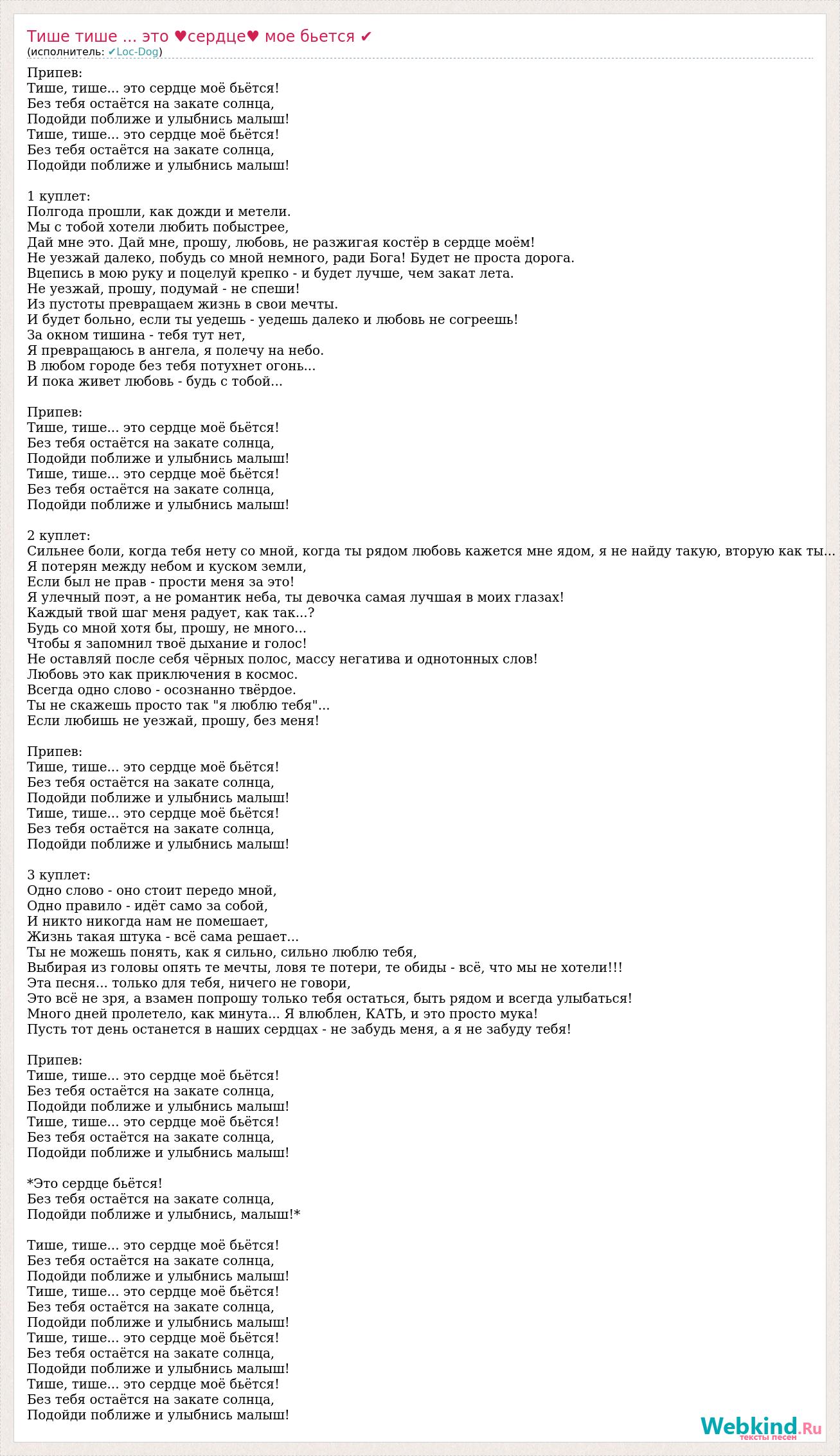 Припев: Тише, тише... это сердце моё бьётся! Без тебя остаётся на закате солнца, Подойди поближе и улыбнись малыш! Тише, тише... это сердце моё бьётся! Без тебя остаётся на закате солнца, Подойди поближе и улыбнись малыш! 1 куплет: Полгода прошли, как дожди и метели. Мы с тобой хотели любить побыстрее, Дай мне это. Дай мне, прошу, любовь, не разжигая костёр в сердце моём! Не уезжай далеко, побудь со мной немного, ради Бога! Будет не проста дорога. Вцепись в мою руку и поцелуй крепко - и будет лучше, чем закат лета. Не уезжай, прошу, подумай - не спеши! Из пустоты превращаем жизнь в свои мечты. И будет больно, если ты уедешь - уедешь далеко и любовь не согреешь! За окном тишина - тебя тут нет, Я превращаюсь в ангела, я полечу на небо. В любом городе без тебя потухнет огонь... И пока живет любовь - будь с тобой... Припев: Тише, тише... это сердце моё бьётся! Без тебя остаётся на закате солнца, Подойди поближе и улыбнись малыш! Тише, тише... это сердце моё бьётся! Без тебя остаётся на закате солнца, Подойди поближе и улыбнись малыш! 2 куплет: Сильнее боли, когда тебя нету со мной, когда ты рядом любовь кажется мне ядом, я не найду такую, вторую как ты... Я потерян между небом и куском земли, Если был не прав - прости меня за это! Я улечный поэт, а не романтик неба, ты девочка самая лучшая в моих глазах! Каждый твой шаг меня радует, как так...? Будь со мной хотя бы, прошу, не много... Чтобы я запомнил твоё дыхание и голос! Не оставляй после себя чёрных полос, массу негатива и однотонных слов! Любовь это как приключения в космос. Всегда одно слово - осознанно твёрдое. Ты не скажешь просто так "я люблю тебя"... Если любишь не уезжай, прошу, без меня! Припев: Тише, тише... это сердце моё бьётся! Без тебя остаётся на закате солнца, Подойди поближе и улыбнись малыш! Тише, тише... это сердце моё бьётся! Без тебя остаётся на закате солнца, Подойди поближе и улыбнись малыш! 3 куплет: Одно слово - оно стоит передо мной, Одно правило - идёт само за собой, И никто никогда нам не помешает, Жизнь такая штука - всё сама решает... Ты не можешь понять, как я сильно, сильно люблю тебя, Выбирая из головы опять те мечты, ловя те потери, те обиды - всё, что мы не хотели!!! Эта песня... только для тебя, ничего не говори, Это всё не зря, а взамен попрошу только тебя остаться, быть рядом и всегда улыбаться! Много дней пролетело, как минута... Я влюблен, КАТЬ, и это просто мука! Пусть тот день останется в наших сердцах - не забудь меня, а я не забуду тебя! Припев: Тише, тише... это сердце моё бьётся! Без тебя остаётся на закате солнца, Подойди поближе и улыбнись малыш! Тише, тише... это сердце моё бьётся! Без тебя остаётся на закате солнца, Подойди поближе и улыбнись малыш! *Это сердце бьётся! Без тебя остаётся на закате солнца, Подойди поближе и улыбнись, малыш!* Тише, тише... это сердце моё бьётся! Без тебя остаётся на закате солнца, Подойди поближе и улыбнись малыш! Тише, тише... это сердце моё бьётся! Без тебя остаётся на закате солнца, Подойди поближе и улыбнись малыш! Тише, тише... это сердце моё бьётся! Без тебя остаётся на закате солнца, Подойди поближе и улыбнись малыш! Тише, тише... это сердце моё бьётся! Без тебя остаётся на закате солнца, Подойди поближе и улыбнись малыш!