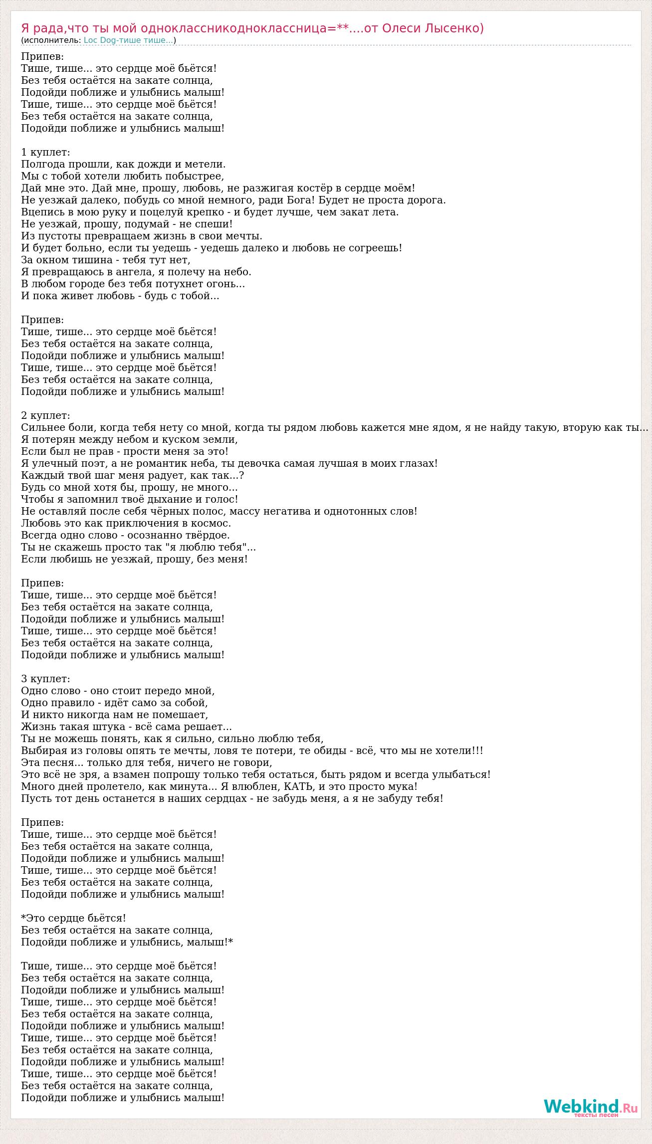 Главная→Исполнители→Loc Dog-тише тише...→Я рада,что ты мой одноклассникодноклассница=**....от Олеси Лысенко)