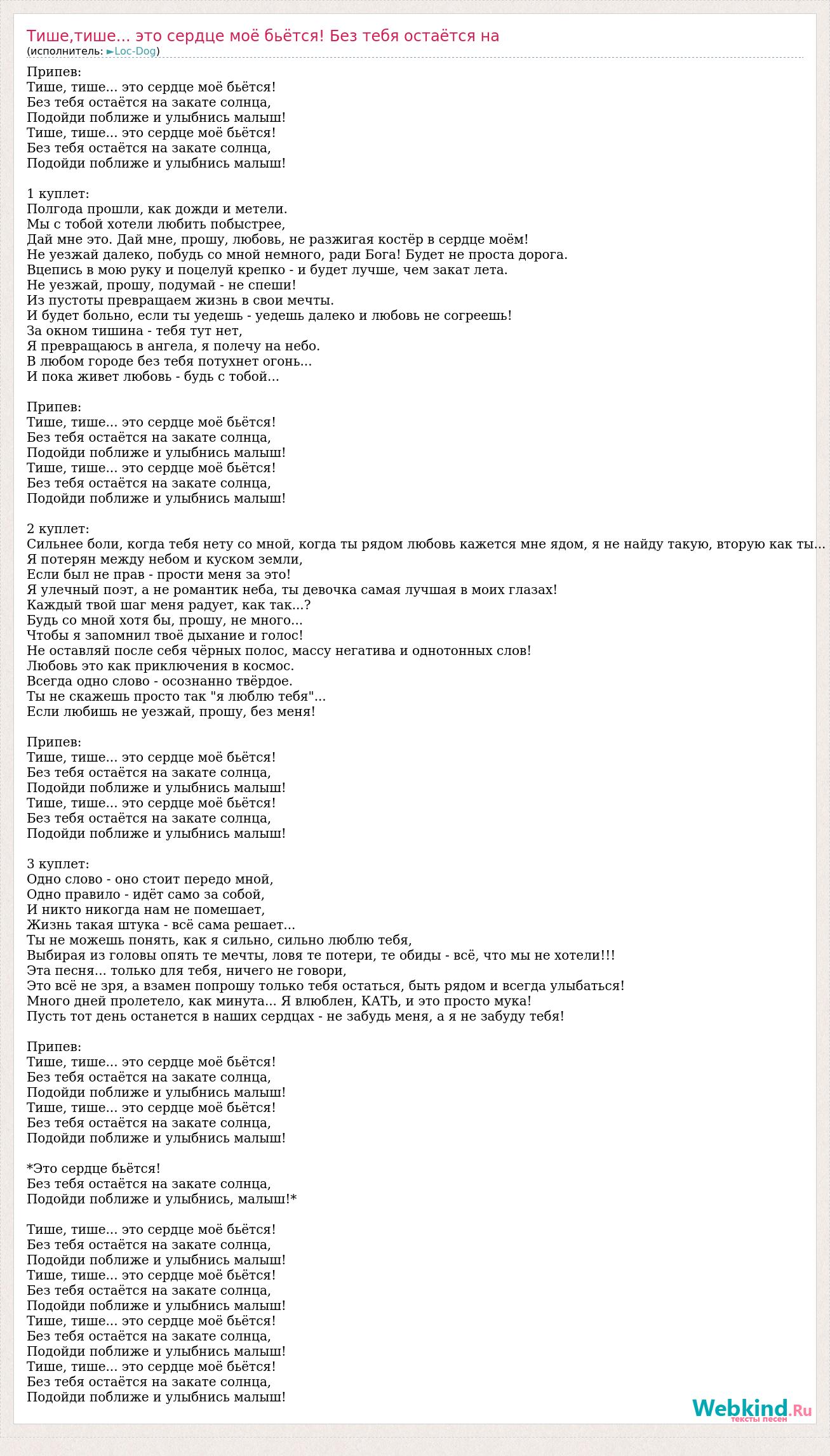 Припев: Тише, тише... это сердце моё бьётся! Без тебя остаётся на закате солнца, Подойди поближе и улыбнись малыш! Тише, тише... это сердце моё бьётся! Без тебя остаётся на закате солнца, Подойди поближе и улыбнись малыш! 1 куплет: Полгода прошли, как дожди и метели. Мы с тобой хотели любить побыстрее, Дай мне это. Дай мне, прошу, любовь, не разжигая костёр в сердце моём! Не уезжай далеко, побудь со мной немного, ради Бога! Будет не проста дорога. Вцепись в мою руку и поцелуй крепко - и будет лучше, чем закат лета. Не уезжай, прошу, подумай - не спеши! Из пустоты превращаем жизнь в свои мечты. И будет больно, если ты уедешь - уедешь далеко и любовь не согреешь! За окном тишина - тебя тут нет, Я превращаюсь в ангела, я полечу на небо. В любом городе без тебя потухнет огонь... И пока живет любовь - будь с тобой... Припев: Тише, тише... это сердце моё бьётся! Без тебя остаётся на закате солнца, Подойди поближе и улыбнись малыш! Тише, тише... это сердце моё бьётся! Без тебя остаётся на закате солнца, Подойди поближе и улыбнись малыш! 2 куплет: Сильнее боли, когда тебя нету со мной, когда ты рядом любовь кажется мне ядом, я не найду такую, вторую как ты... Я потерян между небом и куском земли, Если был не прав - прости меня за это! Я улечный поэт, а не романтик неба, ты девочка самая лучшая в моих глазах! Каждый твой шаг меня радует, как так...? Будь со мной хотя бы, прошу, не много... Чтобы я запомнил твоё дыхание и голос! Не оставляй после себя чёрных полос, массу негатива и однотонных слов! Любовь это как приключения в космос. Всегда одно слово - осознанно твёрдое. Ты не скажешь просто так "я люблю тебя"... Если любишь не уезжай, прошу, без меня! Припев: Тише, тише... это сердце моё бьётся! Без тебя остаётся на закате солнца, Подойди поближе и улыбнись малыш! Тише, тише... это сердце моё бьётся! Без тебя остаётся на закате солнца, Подойди поближе и улыбнись малыш! 3 куплет: Одно слово - оно стоит передо мной, Одно правило - идёт само за собой, И никто никогда нам не помешает, Жизнь такая штука - всё сама решает... Ты не можешь понять, как я сильно, сильно люблю тебя, Выбирая из головы опять те мечты, ловя те потери, те обиды - всё, что мы не хотели!!! Эта песня... только для тебя, ничего не говори, Это всё не зря, а взамен попрошу только тебя остаться, быть рядом и всегда улыбаться! Много дней пролетело, как минута... Я влюблен, КАТЬ, и это просто мука! Пусть тот день останется в наших сердцах - не забудь меня, а я не забуду тебя! Припев: Тише, тише... это сердце моё бьётся! Без тебя остаётся на закате солнца, Подойди поближе и улыбнись малыш! Тише, тише... это сердце моё бьётся! Без тебя остаётся на закате солнца, Подойди поближе и улыбнись малыш! *Это сердце бьётся! Без тебя остаётся на закате солнца, Подойди поближе и улыбнись, малыш!* Тише, тише... это сердце моё бьётся! Без тебя остаётся на закате солнца, Подойди поближе и улыбнись малыш! Тише, тише... это сердце моё бьётся! Без тебя остаётся на закате солнца, Подойди поближе и улыбнись малыш! Тише, тише... это сердце моё бьётся! Без тебя остаётся на закате солнца, Подойди поближе и улыбнись малыш! Тише, тише... это сердце моё бьётся! Без тебя остаётся на закате солнца, Подойди поближе и улыбнись малыш!