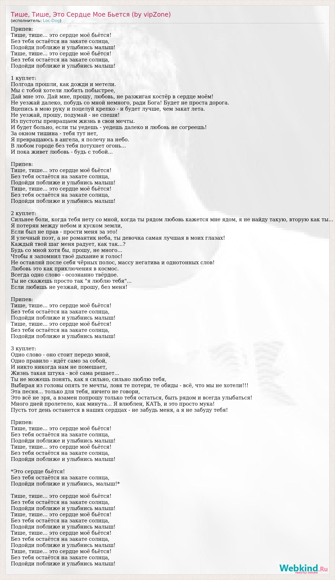 Припев: Тише, тише... это сердце моё бьётся! Без тебя остаётся на закате солнца, Подойди поближе и улыбнись малыш! Тише, тише... это сердце моё бьётся! Без тебя остаётся на закате солнца, Подойди поближе и улыбнись малыш! 1 куплет: Полгода прошли, как дожди и метели. Мы с тобой хотели любить побыстрее, Дай мне это. Дай мне, прошу, любовь, не разжигая костёр в сердце моём! Не уезжай далеко, побудь со мной немного, ради Бога! Будет не проста дорога. Вцепись в мою руку и поцелуй крепко - и будет лучше, чем закат лета. Не уезжай, прошу, подумай - не спеши! Из пустоты превращаем жизнь в свои мечты. И будет больно, если ты уедешь - уедешь далеко и любовь не согреешь! За окном тишина - тебя тут нет, Я превращаюсь в ангела, я полечу на небо. В любом городе без тебя потухнет огонь... И пока живет любовь - будь с тобой... Припев: Тише, тише... это сердце моё бьётся! Без тебя остаётся на закате солнца, Подойди поближе и улыбнись малыш! Тише, тише... это сердце моё бьётся! Без тебя остаётся на закате солнца, Подойди поближе и улыбнись малыш! 2 куплет: Сильнее боли, когда тебя нету со мной, когда ты рядом любовь кажется мне ядом, я не найду такую, вторую как ты... Я потерян между небом и куском земли, Если был не прав - прости меня за это! Я улечный поэт, а не романтик неба, ты девочка самая лучшая в моих глазах! Каждый твой шаг меня радует, как так...? Будь со мной хотя бы, прошу, не много... Чтобы я запомнил твоё дыхание и голос! Не оставляй после себя чёрных полос, массу негатива и однотонных слов! Любовь это как приключения в космос. Всегда одно слово - осознанно твёрдое. Ты не скажешь просто так "я люблю тебя"... Если любишь не уезжай, прошу, без меня! Припев: Тише, тише... это сердце моё бьётся! Без тебя остаётся на закате солнца, Подойди поближе и улыбнись малыш! Тише, тише... это сердце моё бьётся! Без тебя остаётся на закате солнца, Подойди поближе и улыбнись малыш! 3 куплет: Одно слово - оно стоит передо мной, Одно правило - идёт само за собой, И никто никогда нам не помешает, Жизнь такая штука - всё сама решает... Ты не можешь понять, как я сильно, сильно люблю тебя, Выбирая из головы опять те мечты, ловя те потери, те обиды - всё, что мы не хотели!!! Эта песня... только для тебя, ничего не говори, Это всё не зря, а взамен попрошу только тебя остаться, быть рядом и всегда улыбаться! Много дней пролетело, как минута... Я влюблен, КАТЬ, и это просто мука! Пусть тот день останется в наших сердцах - не забудь меня, а я не забуду тебя! Припев: Тише, тише... это сердце моё бьётся! Без тебя остаётся на закате солнца, Подойди поближе и улыбнись малыш! Тише, тише... это сердце моё бьётся! Без тебя остаётся на закате солнца, Подойди поближе и улыбнись малыш! *Это сердце бьётся! Без тебя остаётся на закате солнца, Подойди поближе и улыбнись, малыш!* Тише, тише... это сердце моё бьётся! Без тебя остаётся на закате солнца, Подойди поближе и улыбнись малыш! Тише, тише... это сердце моё бьётся! Без тебя остаётся на закате солнца, Подойди поближе и улыбнись малыш! Тише, тише... это сердце моё бьётся! Без тебя остаётся на закате солнца, Подойди поближе и улыбнись малыш! Тише, тише... это сердце моё бьётся! Без тебя остаётся на закате солнца, Подойди поближе и улыбнись малыш!