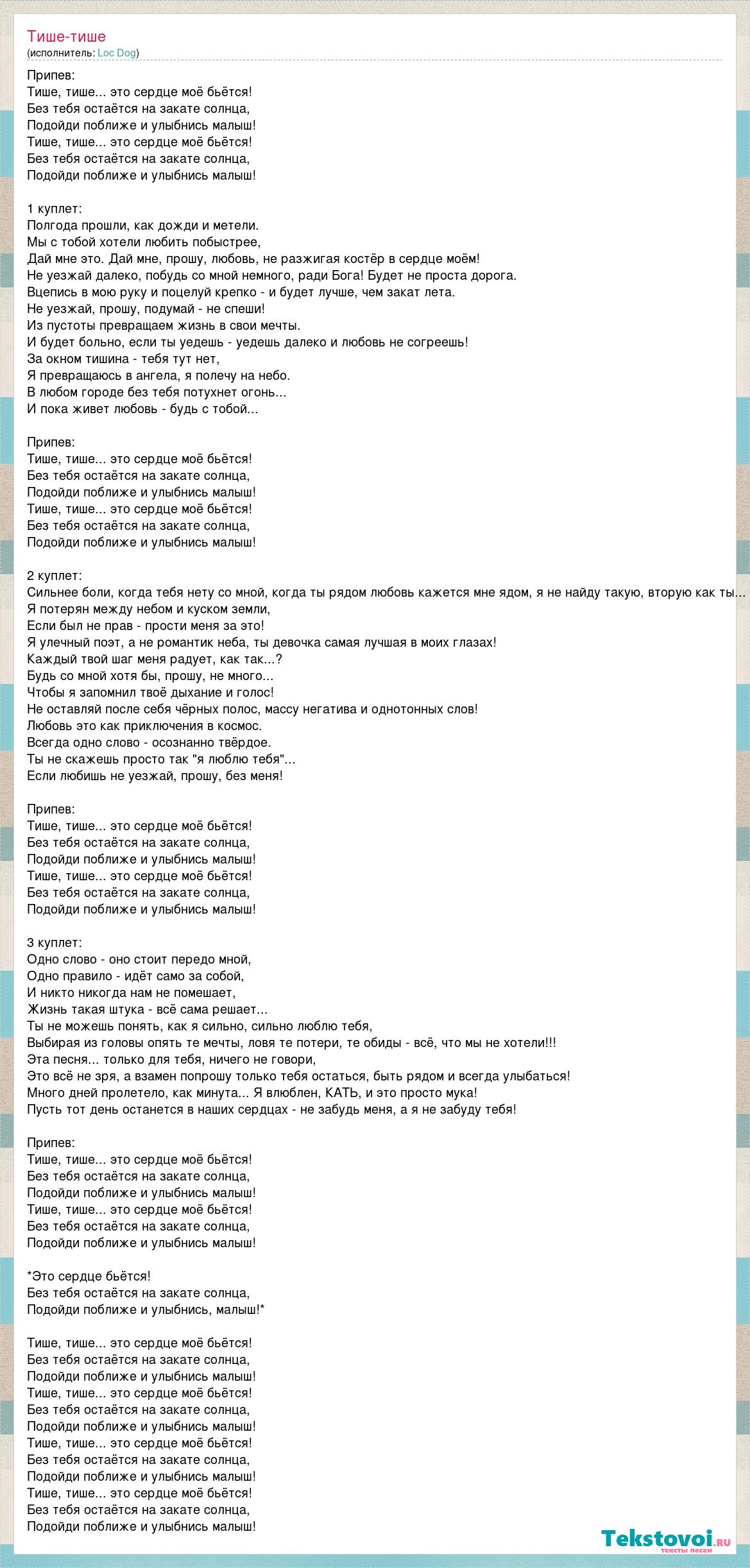 Припев: Тише, тише... это сердце моё бьётся! Без тебя остаётся на закате солнца, Подойди поближе и улыбнись малыш! Тише, тише... это сердце моё бьётся! Без тебя остаётся на закате солнца, Подойди поближе и улыбнись малыш! 1 куплет: Полгода прошли, как дожди и метели. Мы с тобой хотели любить побыстрее, Дай мне это. Дай мне, прошу, любовь, не разжигая костёр в сердце моём! Не уезжай далеко, побудь со мной немного, ради Бога! Будет не проста дорога. Вцепись в мою руку и поцелуй крепко - и будет лучше, чем закат лета. Не уезжай, прошу, подумай - не спеши! Из пустоты превращаем жизнь в свои мечты. И будет больно, если ты уедешь - уедешь далеко и любовь не согреешь! За окном тишина - тебя тут нет, Я превращаюсь в ангела, я полечу на небо. В любом городе без тебя потухнет огонь... И пока живет любовь - будь с тобой... Припев: Тише, тише... это сердце моё бьётся! Без тебя остаётся на закате солнца, Подойди поближе и улыбнись малыш! Тише, тише... это сердце моё бьётся! Без тебя остаётся на закате солнца, Подойди поближе и улыбнись малыш! 2 куплет: Сильнее боли, когда тебя нету со мной, когда ты рядом любовь кажется мне ядом, я не найду такую, вторую как ты... Я потерян между небом и куском земли, Если был не прав - прости меня за это! Я улечный поэт, а не романтик неба, ты девочка самая лучшая в моих глазах! Каждый твой шаг меня радует, как так...? Будь со мной хотя бы, прошу, не много... Чтобы я запомнил твоё дыхание и голос! Не оставляй после себя чёрных полос, массу негатива и однотонных слов! Любовь это как приключения в космос. Всегда одно слово - осознанно твёрдое. Ты не скажешь просто так "я люблю тебя"... Если любишь не уезжай, прошу, без меня! Припев: Тише, тише... это сердце моё бьётся! Без тебя остаётся на закате солнца, Подойди поближе и улыбнись малыш! Тише, тише... это сердце моё бьётся! Без тебя остаётся на закате солнца, Подойди поближе и улыбнись малыш! 3 куплет: Одно слово - оно стоит передо мной, Одно правило - идёт само за собой, И никто никогда нам не помешает, Жизнь такая штука - всё сама решает... Ты не можешь понять, как я сильно, сильно люблю тебя, Выбирая из головы опять те мечты, ловя те потери, те обиды - всё, что мы не хотели!!! Эта песня... только для тебя, ничего не говори, Это всё не зря, а взамен попрошу только тебя остаться, быть рядом и всегда улыбаться! Много дней пролетело, как минута... Я влюблен, КАТЬ, и это просто мука! Пусть тот день останется в наших сердцах - не забудь меня, а я не забуду тебя! Припев: Тише, тише... это сердце моё бьётся! Без тебя остаётся на закате солнца, Подойди поближе и улыбнись малыш! Тише, тише... это сердце моё бьётся! Без тебя остаётся на закате солнца, Подойди поближе и улыбнись малыш! *Это сердце бьётся! Без тебя остаётся на закате солнца, Подойди поближе и улыбнись, малыш!* Тише, тише... это сердце моё бьётся! Без тебя остаётся на закате солнца, Подойди поближе и улыбнись малыш! Тише, тише... это сердце моё бьётся! Без тебя остаётся на закате солнца, Подойди поближе и улыбнись малыш! Тише, тише... это сердце моё бьётся! Без тебя остаётся на закате солнца, Подойди поближе и улыбнись малыш! Тише, тише... это сердце моё бьётся! Без тебя остаётся на закате солнца, Подойди поближе и улыбнись малыш!