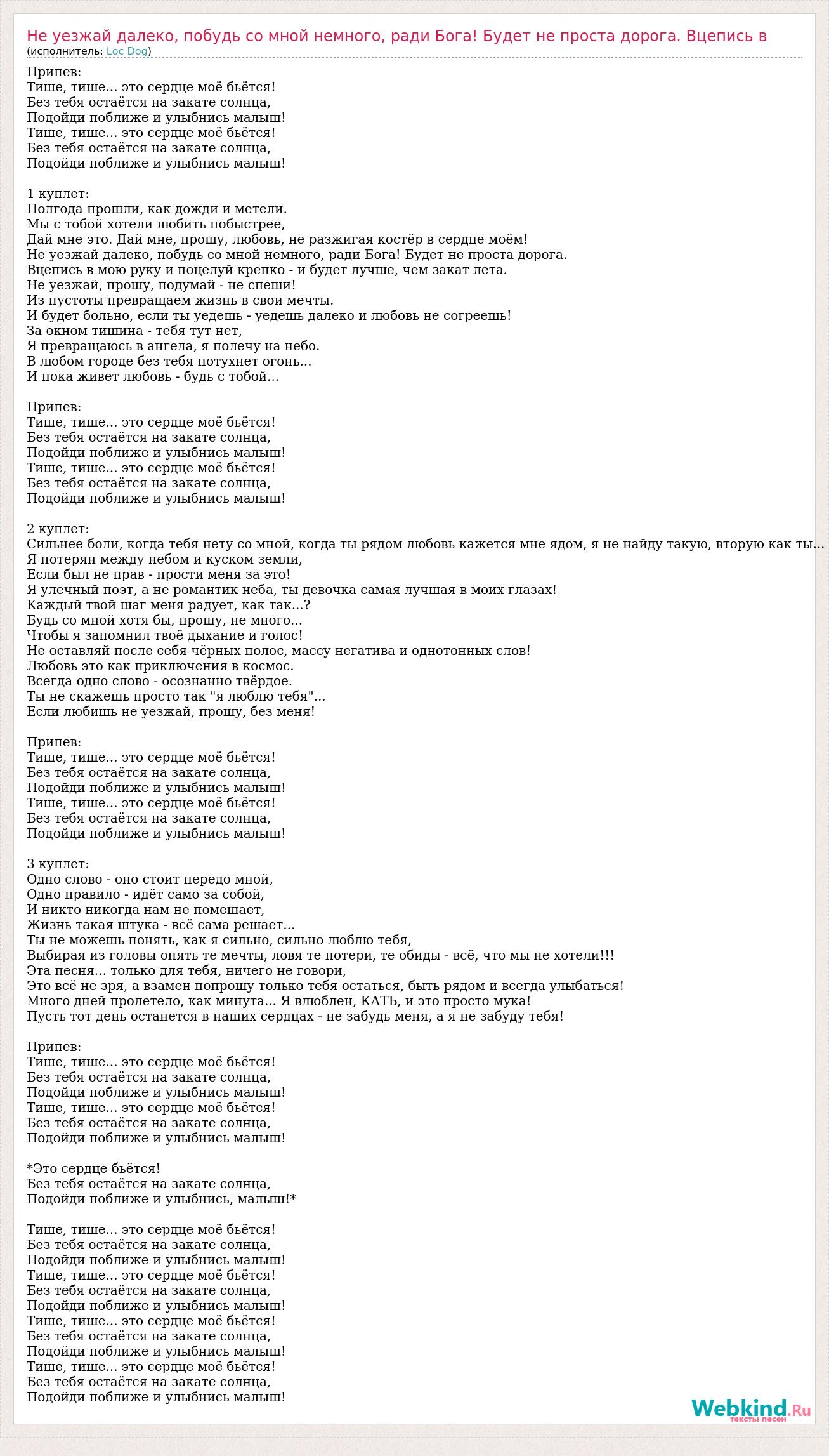Главная→Исполнители→Loc Dog→Не уезжай далеко, побудь со мной немного, ради Бога! Будет не проста дорог
