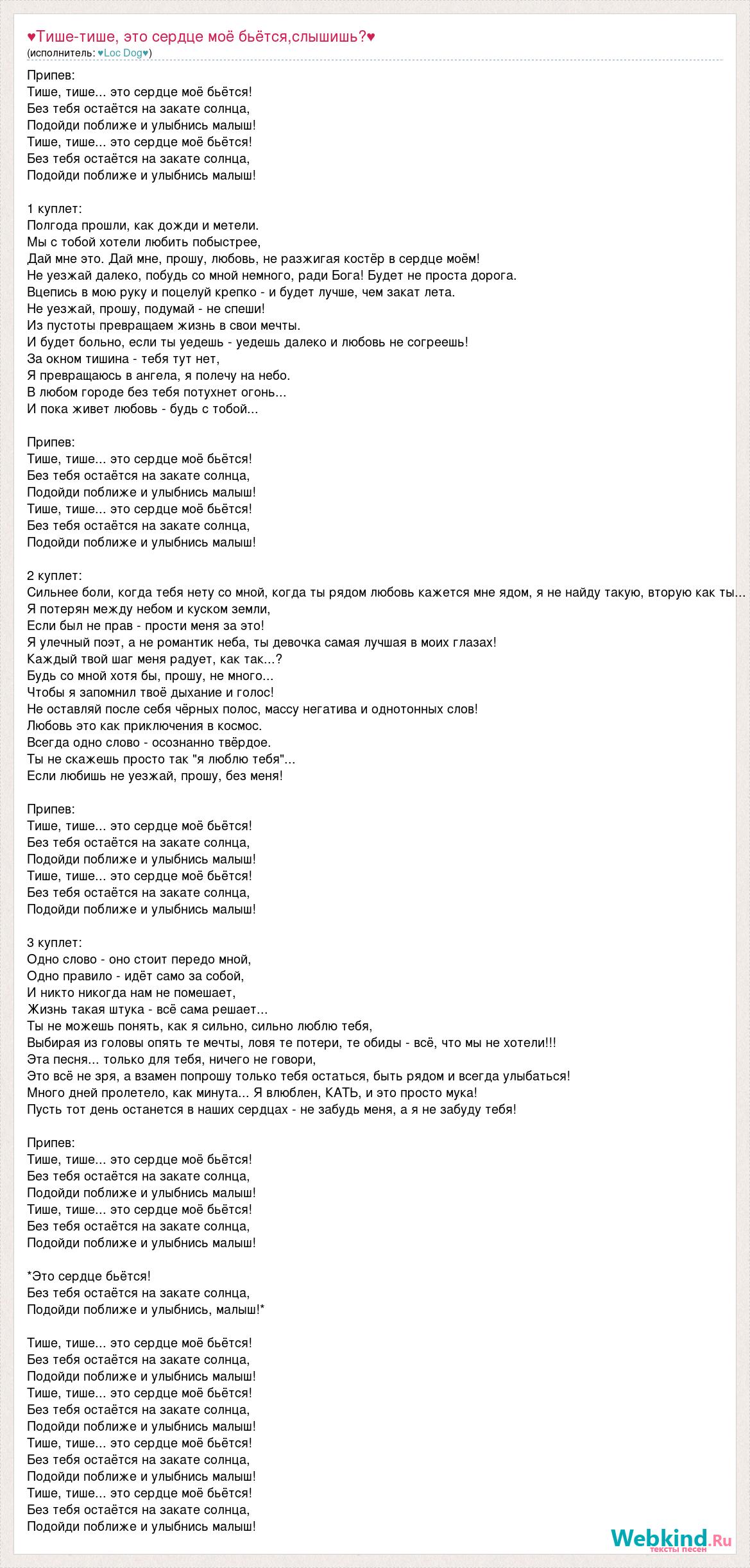 Припев: Тише, тише... это сердце моё бьётся! Без тебя остаётся на закате солнца, Подойди поближе и улыбнись малыш! Тише, тише... это сердце моё бьётся! Без тебя остаётся на закате солнца, Подойди поближе и улыбнись малыш! 1 куплет: Полгода прошли, как дожди и метели. Мы с тобой хотели любить побыстрее, Дай мне это. Дай мне, прошу, любовь, не разжигая костёр в сердце моём! Не уезжай далеко, побудь со мной немного, ради Бога! Будет не проста дорога. Вцепись в мою руку и поцелуй крепко - и будет лучше, чем закат лета. Не уезжай, прошу, подумай - не спеши! Из пустоты превращаем жизнь в свои мечты. И будет больно, если ты уедешь - уедешь далеко и любовь не согреешь! За окном тишина - тебя тут нет, Я превращаюсь в ангела, я полечу на небо. В любом городе без тебя потухнет огонь... И пока живет любовь - будь с тобой... Припев: Тише, тише... это сердце моё бьётся! Без тебя остаётся на закате солнца, Подойди поближе и улыбнись малыш! Тише, тише... это сердце моё бьётся! Без тебя остаётся на закате солнца, Подойди поближе и улыбнись малыш! 2 куплет: Сильнее боли, когда тебя нету со мной, когда ты рядом любовь кажется мне ядом, я не найду такую, вторую как ты... Я потерян между небом и куском земли, Если был не прав - прости меня за это! Я улечный поэт, а не романтик неба, ты девочка самая лучшая в моих глазах! Каждый твой шаг меня радует, как так...? Будь со мной хотя бы, прошу, не много... Чтобы я запомнил твоё дыхание и голос! Не оставляй после себя чёрных полос, массу негатива и однотонных слов! Любовь это как приключения в космос. Всегда одно слово - осознанно твёрдое. Ты не скажешь просто так "я люблю тебя"... Если любишь не уезжай, прошу, без меня! Припев: Тише, тише... это сердце моё бьётся! Без тебя остаётся на закате солнца, Подойди поближе и улыбнись малыш! Тише, тише... это сердце моё бьётся! Без тебя остаётся на закате солнца, Подойди поближе и улыбнись малыш! 3 куплет: Одно слово - оно стоит передо мной, Одно правило - идёт само за собой, И никто никогда нам не помешает, Жизнь такая штука - всё сама решает... Ты не можешь понять, как я сильно, сильно люблю тебя, Выбирая из головы опять те мечты, ловя те потери, те обиды - всё, что мы не хотели!!! Эта песня... только для тебя, ничего не говори, Это всё не зря, а взамен попрошу только тебя остаться, быть рядом и всегда улыбаться! Много дней пролетело, как минута... Я влюблен, КАТЬ, и это просто мука! Пусть тот день останется в наших сердцах - не забудь меня, а я не забуду тебя! Припев: Тише, тише... это сердце моё бьётся! Без тебя остаётся на закате солнца, Подойди поближе и улыбнись малыш! Тише, тише... это сердце моё бьётся! Без тебя остаётся на закате солнца, Подойди поближе и улыбнись малыш! *Это сердце бьётся! Без тебя остаётся на закате солнца, Подойди поближе и улыбнись, малыш!* Тише, тише... это сердце моё бьётся! Без тебя остаётся на закате солнца, Подойди поближе и улыбнись малыш! Тише, тише... это сердце моё бьётся! Без тебя остаётся на закате солнца, Подойди поближе и улыбнись малыш! Тише, тише... это сердце моё бьётся! Без тебя остаётся на закате солнца, Подойди поближе и улыбнись малыш! Тише, тише... это сердце моё бьётся! Без тебя остаётся на закате солнца, Подойди поближе и улыбнись малыш!