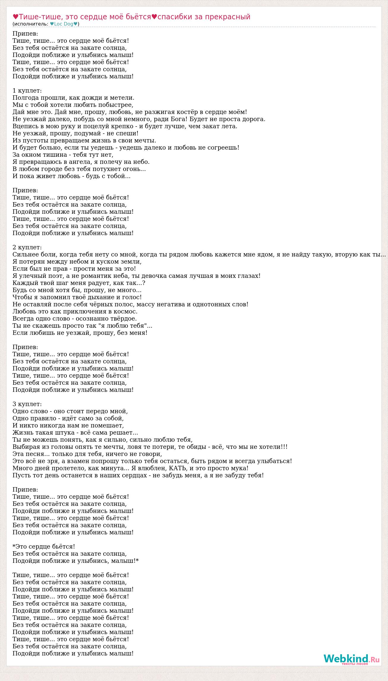 Припев: Тише, тише... это сердце моё бьётся! Без тебя остаётся на закате солнца, Подойди поближе и улыбнись малыш! Тише, тише... это сердце моё бьётся! Без тебя остаётся на закате солнца, Подойди поближе и улыбнись малыш! 1 куплет: Полгода прошли, как дожди и метели. Мы с тобой хотели любить побыстрее, Дай мне это. Дай мне, прошу, любовь, не разжигая костёр в сердце моём! Не уезжай далеко, побудь со мной немного, ради Бога! Будет не проста дорога. Вцепись в мою руку и поцелуй крепко - и будет лучше, чем закат лета. Не уезжай, прошу, подумай - не спеши! Из пустоты превращаем жизнь в свои мечты. И будет больно, если ты уедешь - уедешь далеко и любовь не согреешь! За окном тишина - тебя тут нет, Я превращаюсь в ангела, я полечу на небо. В любом городе без тебя потухнет огонь... И пока живет любовь - будь с тобой... Припев: Тише, тише... это сердце моё бьётся! Без тебя остаётся на закате солнца, Подойди поближе и улыбнись малыш! Тише, тише... это сердце моё бьётся! Без тебя остаётся на закате солнца, Подойди поближе и улыбнись малыш! 2 куплет: Сильнее боли, когда тебя нету со мной, когда ты рядом любовь кажется мне ядом, я не найду такую, вторую как ты... Я потерян между небом и куском земли, Если был не прав - прости меня за это! Я улечный поэт, а не романтик неба, ты девочка самая лучшая в моих глазах! Каждый твой шаг меня радует, как так...? Будь со мной хотя бы, прошу, не много... Чтобы я запомнил твоё дыхание и голос! Не оставляй после себя чёрных полос, массу негатива и однотонных слов! Любовь это как приключения в космос. Всегда одно слово - осознанно твёрдое. Ты не скажешь просто так "я люблю тебя"... Если любишь не уезжай, прошу, без меня! Припев: Тише, тише... это сердце моё бьётся! Без тебя остаётся на закате солнца, Подойди поближе и улыбнись малыш! Тише, тише... это сердце моё бьётся! Без тебя остаётся на закате солнца, Подойди поближе и улыбнись малыш! 3 куплет: Одно слово - оно стоит передо мной, Одно правило - идёт само за собой, И никто никогда нам не помешает, Жизнь такая штука - всё сама решает... Ты не можешь понять, как я сильно, сильно люблю тебя, Выбирая из головы опять те мечты, ловя те потери, те обиды - всё, что мы не хотели!!! Эта песня... только для тебя, ничего не говори, Это всё не зря, а взамен попрошу только тебя остаться, быть рядом и всегда улыбаться! Много дней пролетело, как минута... Я влюблен, КАТЬ, и это просто мука! Пусть тот день останется в наших сердцах - не забудь меня, а я не забуду тебя! Припев: Тише, тише... это сердце моё бьётся! Без тебя остаётся на закате солнца, Подойди поближе и улыбнись малыш! Тише, тише... это сердце моё бьётся! Без тебя остаётся на закате солнца, Подойди поближе и улыбнись малыш! *Это сердце бьётся! Без тебя остаётся на закате солнца, Подойди поближе и улыбнись, малыш!* Тише, тише... это сердце моё бьётся! Без тебя остаётся на закате солнца, Подойди поближе и улыбнись малыш! Тише, тише... это сердце моё бьётся! Без тебя остаётся на закате солнца, Подойди поближе и улыбнись малыш! Тише, тише... это сердце моё бьётся! Без тебя остаётся на закате солнца, Подойди поближе и улыбнись малыш! Тише, тише... это сердце моё бьётся! Без тебя остаётся на закате солнца, Подойди поближе и улыбнись малыш!