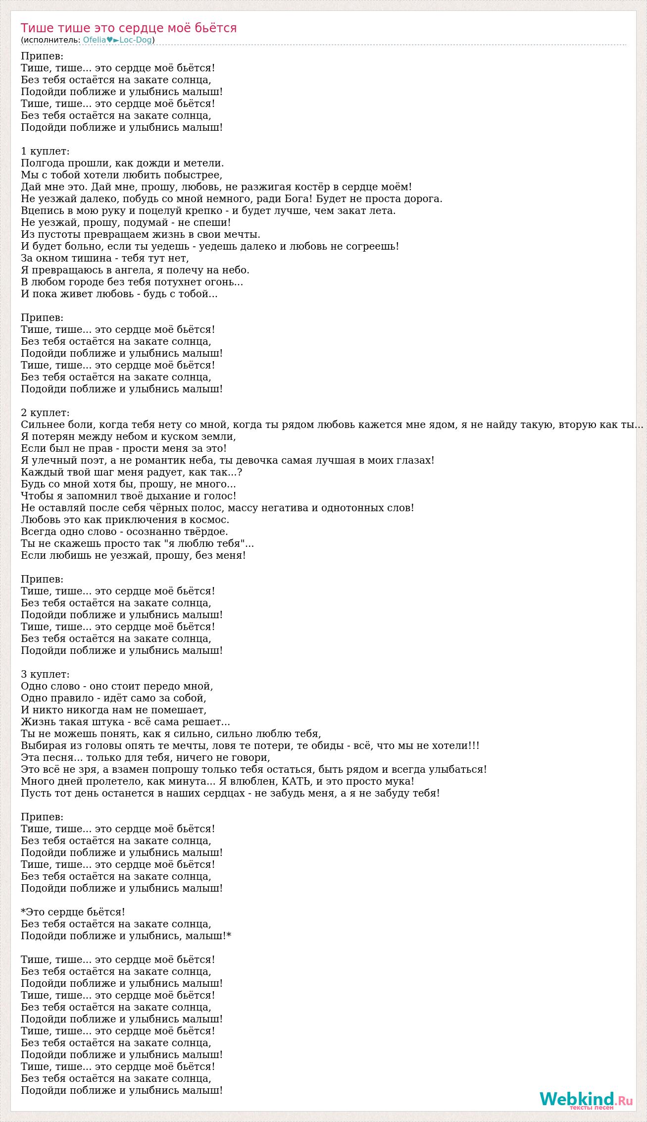Припев: Тише, тише... это сердце моё бьётся! Без тебя остаётся на закате солнца, Подойди поближе и улыбнись малыш! Тише, тише... это сердце моё бьётся! Без тебя остаётся на закате солнца, Подойди поближе и улыбнись малыш! 1 куплет: Полгода прошли, как дожди и метели. Мы с тобой хотели любить побыстрее, Дай мне это. Дай мне, прошу, любовь, не разжигая костёр в сердце моём! Не уезжай далеко, побудь со мной немного, ради Бога! Будет не проста дорога. Вцепись в мою руку и поцелуй крепко - и будет лучше, чем закат лета. Не уезжай, прошу, подумай - не спеши! Из пустоты превращаем жизнь в свои мечты. И будет больно, если ты уедешь - уедешь далеко и любовь не согреешь! За окном тишина - тебя тут нет, Я превращаюсь в ангела, я полечу на небо. В любом городе без тебя потухнет огонь... И пока живет любовь - будь с тобой... Припев: Тише, тише... это сердце моё бьётся! Без тебя остаётся на закате солнца, Подойди поближе и улыбнись малыш! Тише, тише... это сердце моё бьётся! Без тебя остаётся на закате солнца, Подойди поближе и улыбнись малыш! 2 куплет: Сильнее боли, когда тебя нету со мной, когда ты рядом любовь кажется мне ядом, я не найду такую, вторую как ты... Я потерян между небом и куском земли, Если был не прав - прости меня за это! Я улечный поэт, а не романтик неба, ты девочка самая лучшая в моих глазах! Каждый твой шаг меня радует, как так...? Будь со мной хотя бы, прошу, не много... Чтобы я запомнил твоё дыхание и голос! Не оставляй после себя чёрных полос, массу негатива и однотонных слов! Любовь это как приключения в космос. Всегда одно слово - осознанно твёрдое. Ты не скажешь просто так "я люблю тебя"... Если любишь не уезжай, прошу, без меня! Припев: Тише, тише... это сердце моё бьётся! Без тебя остаётся на закате солнца, Подойди поближе и улыбнись малыш! Тише, тише... это сердце моё бьётся! Без тебя остаётся на закате солнца, Подойди поближе и улыбнись малыш! 3 куплет: Одно слово - оно стоит передо мной, Одно правило - идёт само за собой, И никто никогда нам не помешает, Жизнь такая штука - всё сама решает... Ты не можешь понять, как я сильно, сильно люблю тебя, Выбирая из головы опять те мечты, ловя те потери, те обиды - всё, что мы не хотели!!! Эта песня... только для тебя, ничего не говори, Это всё не зря, а взамен попрошу только тебя остаться, быть рядом и всегда улыбаться! Много дней пролетело, как минута... Я влюблен, КАТЬ, и это просто мука! Пусть тот день останется в наших сердцах - не забудь меня, а я не забуду тебя! Припев: Тише, тише... это сердце моё бьётся! Без тебя остаётся на закате солнца, Подойди поближе и улыбнись малыш! Тише, тише... это сердце моё бьётся! Без тебя остаётся на закате солнца, Подойди поближе и улыбнись малыш! *Это сердце бьётся! Без тебя остаётся на закате солнца, Подойди поближе и улыбнись, малыш!* Тише, тише... это сердце моё бьётся! Без тебя остаётся на закате солнца, Подойди поближе и улыбнись малыш! Тише, тише... это сердце моё бьётся! Без тебя остаётся на закате солнца, Подойди поближе и улыбнись малыш! Тише, тише... это сердце моё бьётся! Без тебя остаётся на закате солнца, Подойди поближе и улыбнись малыш! Тише, тише... это сердце моё бьётся! Без тебя остаётся на закате солнца, Подойди поближе и улыбнись малыш!