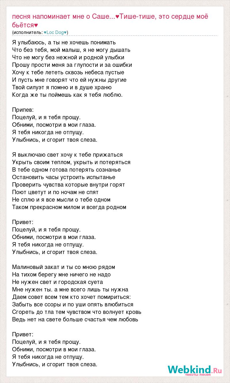Я улыбаюсь, а ты не хочешь понимать Что без тебя, мой малыш, я не могу дышать Что не могу без нежной и родной улыбки Прошу прости меня за глупости и за ошибки Хочу к тебе лететь сквозь небеса пустые И пусть мне говорят что ей нужны другие Твой силуэт я помню и в душе храню Когда же ты поймешь как я тебя люблю. Припев: Поцелуй, и я тебя прощу. Обними, посмотри в мои глаза. Я тебя никогда не отпущу. Улыбнись, и сгорит твоя слеза. Я выключаю свет хочу к тебе прижаться Укрыть своим теплом, укрыть и потеряться В тебе одном готова потерять сознанье Остановить часы устроить испытанье Проверить чувства которые внутри горят Поют цветут и по ночам не спят Не сплю и я все мысли о тебе одном Таком прекрасном милом и всегда родном Привет: Поцелуй, и я тебя прощу. Обними, посмотри в мои глаза. Я тебя никогда не отпущу. Улыбнись, и сгорит твоя слеза. Малиновый закат и ты со мною рядом На тихом берегу мне ничего не надо Не нужен свет и городская суета Мне нужен ты. а мне всего лишь ты нужна Даем совет всем тем кто хочет помириться: Забыть все ссоры и по уши опять влюбиться Сгореть до тла тем чувством что волнует кровь Ведь нет на свете больше счастья чем любовь Привет: Поцелуй, и я тебя прощу. Обними, посмотри в мои глаза. Я тебя никогда не отпущу. Улыбнись, и сгорит твоя слеза.