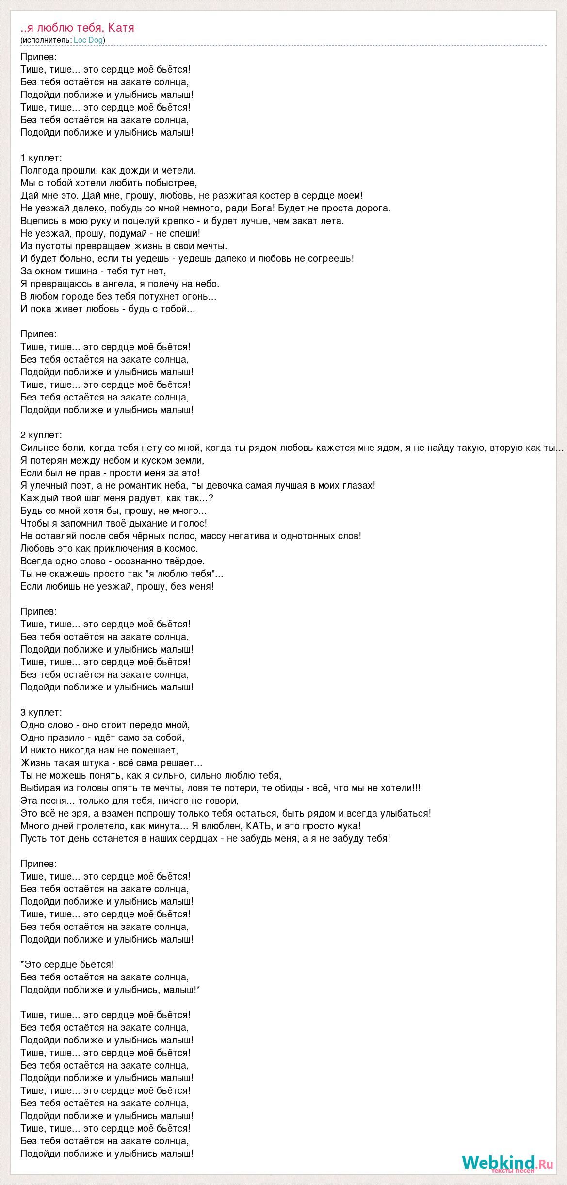 Припев: Тише, тише... это сердце моё бьётся! Без тебя остаётся на закате солнца, Подойди поближе и улыбнись малыш! Тише, тише... это сердце моё бьётся! Без тебя остаётся на закате солнца, Подойди поближе и улыбнись малыш! 1 куплет: Полгода прошли, как дожди и метели. Мы с тобой хотели любить побыстрее, Дай мне это. Дай мне, прошу, любовь, не разжигая костёр в сердце моём! Не уезжай далеко, побудь со мной немного, ради Бога! Будет не проста дорога. Вцепись в мою руку и поцелуй крепко - и будет лучше, чем закат лета. Не уезжай, прошу, подумай - не спеши! Из пустоты превращаем жизнь в свои мечты. И будет больно, если ты уедешь - уедешь далеко и любовь не согреешь! За окном тишина - тебя тут нет, Я превращаюсь в ангела, я полечу на небо. В любом городе без тебя потухнет огонь... И пока живет любовь - будь с тобой... Припев: Тише, тише... это сердце моё бьётся! Без тебя остаётся на закате солнца, Подойди поближе и улыбнись малыш! Тише, тише... это сердце моё бьётся! Без тебя остаётся на закате солнца, Подойди поближе и улыбнись малыш! 2 куплет: Сильнее боли, когда тебя нету со мной, когда ты рядом любовь кажется мне ядом, я не найду такую, вторую как ты... Я потерян между небом и куском земли, Если был не прав - прости меня за это! Я улечный поэт, а не романтик неба, ты девочка самая лучшая в моих глазах! Каждый твой шаг меня радует, как так...? Будь со мной хотя бы, прошу, не много... Чтобы я запомнил твоё дыхание и голос! Не оставляй после себя чёрных полос, массу негатива и однотонных слов! Любовь это как приключения в космос. Всегда одно слово - осознанно твёрдое. Ты не скажешь просто так "я люблю тебя"... Если любишь не уезжай, прошу, без меня! Припев: Тише, тише... это сердце моё бьётся! Без тебя остаётся на закате солнца, Подойди поближе и улыбнись малыш! Тише, тише... это сердце моё бьётся! Без тебя остаётся на закате солнца, Подойди поближе и улыбнись малыш! 3 куплет: Одно слово - оно стоит передо мной, Одно правило - идёт само за собой, И никто никогда нам не помешает, Жизнь такая штука - всё сама решает... Ты не можешь понять, как я сильно, сильно люблю тебя, Выбирая из головы опять те мечты, ловя те потери, те обиды - всё, что мы не хотели!!! Эта песня... только для тебя, ничего не говори, Это всё не зря, а взамен попрошу только тебя остаться, быть рядом и всегда улыбаться! Много дней пролетело, как минута... Я влюблен, КАТЬ, и это просто мука! Пусть тот день останется в наших сердцах - не забудь меня, а я не забуду тебя! Припев: Тише, тише... это сердце моё бьётся! Без тебя остаётся на закате солнца, Подойди поближе и улыбнись малыш! Тише, тише... это сердце моё бьётся! Без тебя остаётся на закате солнца, Подойди поближе и улыбнись малыш! *Это сердце бьётся! Без тебя остаётся на закате солнца, Подойди поближе и улыбнись, малыш!* Тише, тише... это сердце моё бьётся! Без тебя остаётся на закате солнца, Подойди поближе и улыбнись малыш! Тише, тише... это сердце моё бьётся! Без тебя остаётся на закате солнца, Подойди поближе и улыбнись малыш! Тише, тише... это сердце моё бьётся! Без тебя остаётся на закате солнца, Подойди поближе и улыбнись малыш! Тише, тише... это сердце моё бьётся! Без тебя остаётся на закате солнца, Подойди поближе и улыбнись малыш!