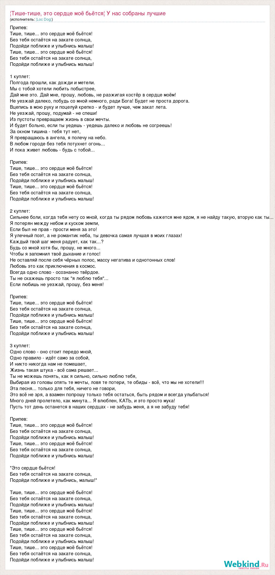 Припев: Тише, тише... это сердце моё бьётся! Без тебя остаётся на закате солнца, Подойди поближе и улыбнись малыш! Тише, тише... это сердце моё бьётся! Без тебя остаётся на закате солнца, Подойди поближе и улыбнись малыш! 1 куплет: Полгода прошли, как дожди и метели. Мы с тобой хотели любить побыстрее, Дай мне это. Дай мне, прошу, любовь, не разжигая костёр в сердце моём! Не уезжай далеко, побудь со мной немного, ради Бога! Будет не проста дорога. Вцепись в мою руку и поцелуй крепко - и будет лучше, чем закат лета. Не уезжай, прошу, подумай - не спеши! Из пустоты превращаем жизнь в свои мечты. И будет больно, если ты уедешь - уедешь далеко и любовь не согреешь! За окном тишина - тебя тут нет, Я превращаюсь в ангела, я полечу на небо. В любом городе без тебя потухнет огонь... И пока живет любовь - будь с тобой... Припев: Тише, тише... это сердце моё бьётся! Без тебя остаётся на закате солнца, Подойди поближе и улыбнись малыш! Тише, тише... это сердце моё бьётся! Без тебя остаётся на закате солнца, Подойди поближе и улыбнись малыш! 2 куплет: Сильнее боли, когда тебя нету со мной, когда ты рядом любовь кажется мне ядом, я не найду такую, вторую как ты... Я потерян между небом и куском земли, Если был не прав - прости меня за это! Я улечный поэт, а не романтик неба, ты девочка самая лучшая в моих глазах! Каждый твой шаг меня радует, как так...? Будь со мной хотя бы, прошу, не много... Чтобы я запомнил твоё дыхание и голос! Не оставляй после себя чёрных полос, массу негатива и однотонных слов! Любовь это как приключения в космос. Всегда одно слово - осознанно твёрдое. Ты не скажешь просто так "я люблю тебя"... Если любишь не уезжай, прошу, без меня! Припев: Тише, тише... это сердце моё бьётся! Без тебя остаётся на закате солнца, Подойди поближе и улыбнись малыш! Тише, тише... это сердце моё бьётся! Без тебя остаётся на закате солнца, Подойди поближе и улыбнись малыш! 3 куплет: Одно слово - оно стоит передо мной, Одно правило - идёт само за собой, И никто никогда нам не помешает, Жизнь такая штука - всё сама решает... Ты не можешь понять, как я сильно, сильно люблю тебя, Выбирая из головы опять те мечты, ловя те потери, те обиды - всё, что мы не хотели!!! Эта песня... только для тебя, ничего не говори, Это всё не зря, а взамен попрошу только тебя остаться, быть рядом и всегда улыбаться! Много дней пролетело, как минута... Я влюблен, КАТЬ, и это просто мука! Пусть тот день останется в наших сердцах - не забудь меня, а я не забуду тебя! Припев: Тише, тише... это сердце моё бьётся! Без тебя остаётся на закате солнца, Подойди поближе и улыбнись малыш! Тише, тише... это сердце моё бьётся! Без тебя остаётся на закате солнца, Подойди поближе и улыбнись малыш! *Это сердце бьётся! Без тебя остаётся на закате солнца, Подойди поближе и улыбнись, малыш!* Тише, тише... это сердце моё бьётся! Без тебя остаётся на закате солнца, Подойди поближе и улыбнись малыш! Тише, тише... это сердце моё бьётся! Без тебя остаётся на закате солнца, Подойди поближе и улыбнись малыш! Тише, тише... это сердце моё бьётся! Без тебя остаётся на закате солнца, Подойди поближе и улыбнись малыш! Тише, тише... это сердце моё бьётся! Без тебя остаётся на закате солнца, Подойди поближе и улыбнись малыш!