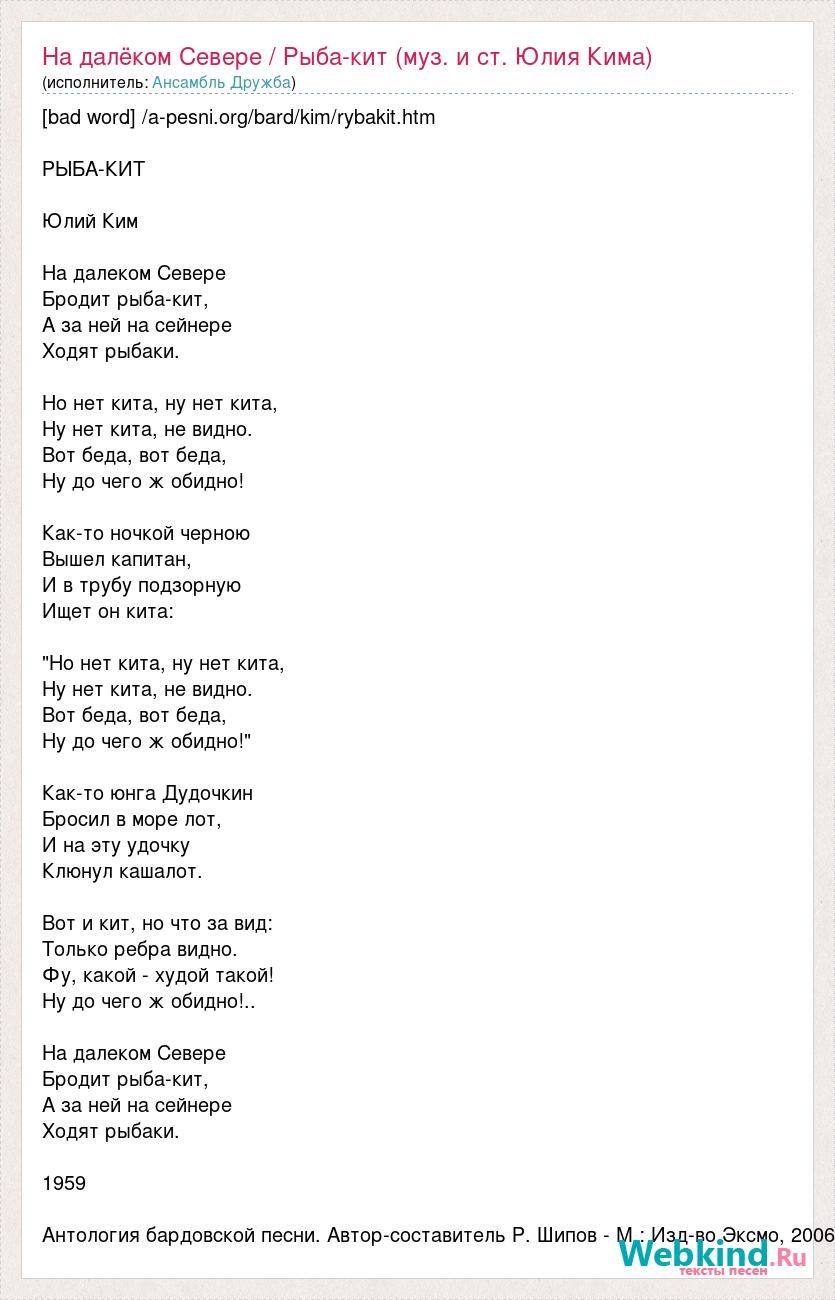 [bad word] /a-pesni.org/bard/kim/rybakit.htm РЫБА-КИТ Юлий Ким На далеком Севере Бродит рыба-кит, А за ней на сейнере Ходят рыбаки. Но нет кита, ну нет кита, Ну нет кита, не видно. Вот беда, вот беда, Ну до чего ж обидно! Как-то ночкой черною Вышел капитан, И в трубу подзорную Ищет он кита: "Но нет кита, ну нет кита, Ну нет кита, не видно. Вот беда, вот беда, Ну до чего ж обидно!" Как-то юнга Дудочкин Бросил в море лот, И на эту удочку Клюнул кашалот. Вот и кит, но что за вид: Только ребра видно. Фу, какой - худой такой! Ну до чего ж обидно!.. На далеком Севере Бродит рыба-кит, А за ней на сейнере Ходят рыбаки. 1959 Антология бардовской песни. Автор-составитель Р. Шипов - М.: Изд-во Эксмо, 2006