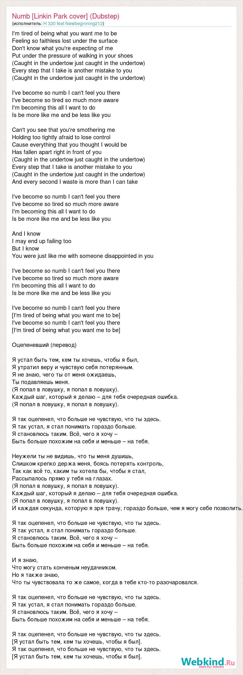 I'm tired of being what you want me to be Feeling so faithless lost under the surface Don't know what you're expecting of me Put under the pressure of walking in your shoes (Caught in the undertow just caught in the undertow) Every step that I take is another mistake to you (Caught in the undertow just caught in the undertow) I've become so numb I can't feel you there I've become so tired so much more aware I'm becoming this all I want to do Is be more like me and be less like you Can't you see that you're smothering me Holding too tightly afraid to lose control Cause everything that you thought I would be Has fallen apart right in front of you (Caught in the undertow just caught in the undertow) Every step that I take is another mistake to you (Caught in the undertow just caught in the undertow) And every second I waste is more than I can take I've become so numb I can't feel you there I've become so tired so much more aware I'm becoming this all I want to do Is be more like me and be less like you And I know I may end up failing too But I know You were just like me with someone disappointed in you I've become so numb I can't feel you there I've become so tired so much more aware I'm becoming this all I want to do Is be more like me and be less like you I've become so numb I can't feel you there [I'm tired of being what you want me to be] I've become so numb I can't feel you there [I'm tired of being what you want me to be] Оцепеневший (перевод) Я устал быть тем, кем ты хочешь, чтобы я был, Я утратил веру и чувствую себя потерянным. Я не знаю, чего ты от меня ожидаешь, Ты подавляешь меня. (Я попал в ловушку, я попал в ловушку). Каждый шаг, который я делаю – для тебя очередная ошибка. (Я попал в ловушку, я попал в ловушку). Я так оцепенел, что больше не чувствую, что ты здесь. Я так устал, я стал понимать гораздо больше. Я становлюсь таким. Всё, чего я хочу – Быть больше похожим на себя и меньше – на тебя. Неужели ты не видишь, что ты меня душишь, Слишком крепко держа меня, боясь потерять контроль, Так как всё то, каким ты хотела бы, чтобы я стал, Рассыпалось прямо у тебя на глазах. (Я попал в ловушку, я попал в ловушку). Каждый шаг, который я делаю – для тебя очередная ошибка. (Я попал в ловушку, я попал в ловушку). И каждая секунда, которую я зря трачу, гораздо больше, чем я могу себе позволить. Я так оцепенел, что больше не чувствую, что ты здесь. Я так устал, я стал понимать гораздо больше. Я становлюсь таким. Всё, чего я хочу – Быть больше похожим на себя и меньше – на тебя. И я знаю, Что могу стать конченым неудачником. Но я также знаю, Что ты чувствовала то же самое, когда в тебе кто-то разочаровался. Я так оцепенел, что больше не чувствую, что ты здесь. Я так устал, я стал понимать гораздо больше. Я становлюсь таким. Всё, чего я хочу – Быть больше похожим на себя и меньше – на тебя. Я так оцепенел, что больше не чувствую, что ты здесь. [Я устал быть тем, кем ты хочешь, чтобы я был]. Я так оцепенел, что больше не чувствую, что ты здесь. [Я устал быть тем, кем ты хочешь, чтобы я был].