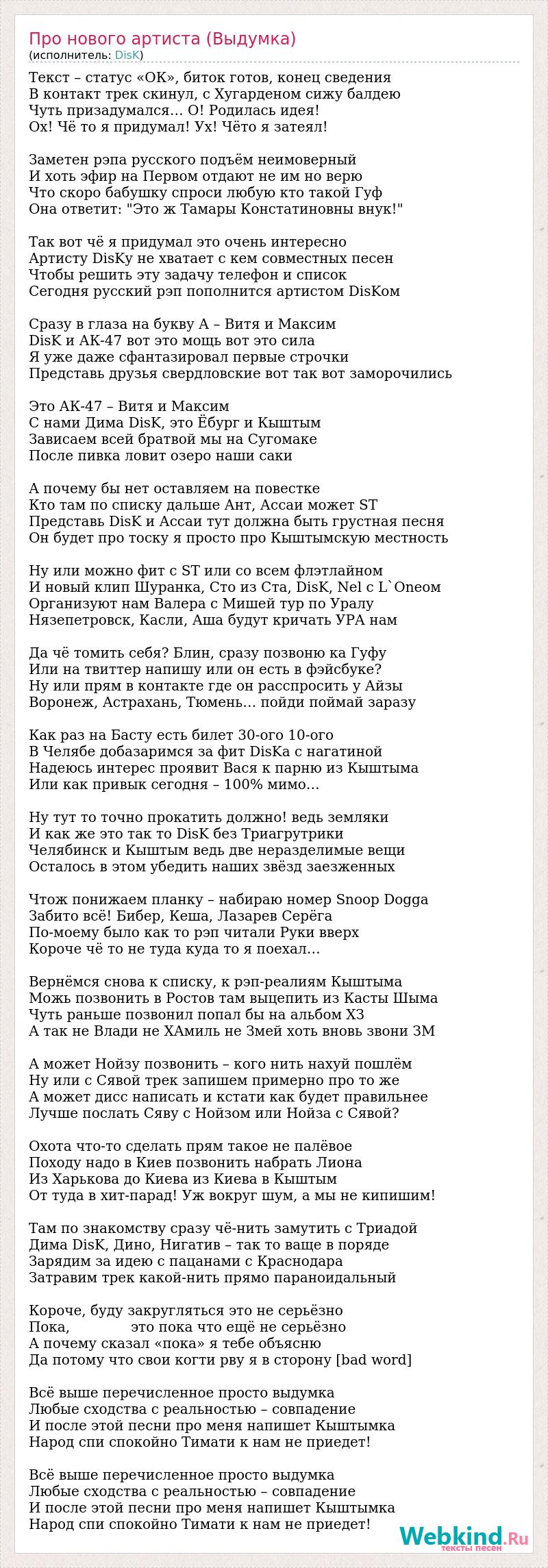 Текст – статус «ОК», биток готов, конец сведения В контакт трек скинул, с Хугарденом сижу балдею Чуть призадумался… О! Родилась идея! Ох! Чё то я придумал! Ух! Чёто я затеял! Заметен рэпа русского подъём неимоверный И хоть эфир на Первом отдают не им но верю Что скоро бабушку спроси любую кто такой Гуф Она ответит: "Это ж Тамары Констатиновны внук!" Так вот чё я придумал это очень интересно Артисту DisKу не хватает с кем совместных песен Чтобы решить эту задачу телефон и список Сегодня русский рэп пополнится артистом DisKом Сразу в глаза на букву А – Витя и Максим DisK и АК-47 вот это мощь вот это сила Я уже даже сфантазировал первые строчки Представь друзья свердловские вот так вот заморочились Это АК-47 – Витя и Максим С нами Дима DisK, это Ёбург и Кыштым Зависаем всей братвой мы на Сугомаке После пивка ловит озеро наши саки А почему бы нет оставляем на повестке Кто там по списку дальше Ант, Ассаи может ST Представь DisK и Ассаи тут должна быть грустная песня Он будет про тоску я просто про Кыштымскую местность Ну или можно фит с ST или со всем флэтлайном И новый клип Шуранка, Сто из Ста, DisK, Nel с L`Oneом Организуют нам Валера с Мишей тур по Уралу Нязепетровск, Касли, Аша будут кричать УРА нам Да чё томить себя? Блин, сразу позвоню ка Гуфу Или на твиттер напишу или он есть в фэйсбуке? Ну или прям в контакте где он расспросить у Айзы Воронеж, Астрахань, Тюмень… пойди поймай заразу Как раз на Басту есть билет 30-ого 10-ого В Челябе добазаримся за фит DisKа с нагатиной Надеюсь интерес проявит Вася к парню из Кыштыма Или как привык сегодня – 100% мимо… Ну тут то точно прокатить должно! ведь земляки И как же это так то DisK без Триагрутрики Челябинск и Кыштым ведь две неразделимые вещи Осталось в этом убедить наших звёзд заезженных Чтож понижаем планку – набираю номер Snoop Doggа Забито всё! Бибер, Кеша, Лазарев Серёга По-моему было как то рэп читали Руки вверх Короче чё то не туда куда то я поехал… Вернёмся снова к списку, к рэп-реалиям Кыштыма Можь позвонить в Ростов там выцепить из Касты Шыма Чуть раньше позвонил попал бы на альбом ХЗ А так не Влади не ХАмиль не Змей хоть вновь звони ЗМ А может Нойзу позвонить – кого нить нахуй пошлём Ну или с Сявой трек запишем примерно про то же А может дисс написать и кстати как будет правильнее Лучше послать Сяву с Нойзом или Нойза с Сявой? Охота что-то сделать прям такое не палёвое Походу надо в Киев позвонить набрать Лиона Из Харькова до Киева из Киева в Кыштым От туда в хит-парад! Уж вокруг шум, а мы не кипишим! Там по знакомству сразу чё-нить замутить с Триадой Дима DisK, Дино, Нигатив – так то ваще в поряде Зарядим за идею с пацанами с Краснодара Затравим трек какой-нить прямо параноидальный Короче, буду закругляться это не серьёзно Пока, это пока что ещё не серьёзно А почему сказал «пока» я тебе объясню Да потому что свои когти рву я в сторону [bad word] Всё выше перечисленное просто выдумка Любые сходства с реальностью – совпадение И после этой песни про меня напишет Кыштымка Народ спи спокойно Тимати к нам не приедет! Всё выше перечисленное просто выдумка Любые сходства с реальностью – совпадение И после этой песни про меня напишет Кыштымка Народ спи спокойно Тимати к нам не приедет!