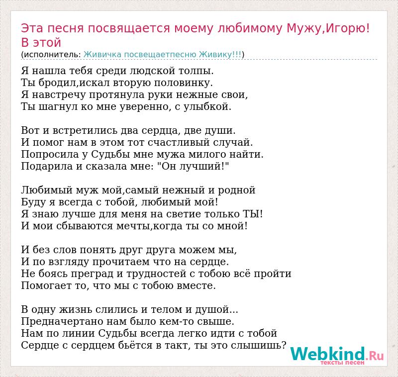 Я нашла тебя среди людской толпы. Ты бродил,искал вторую половинку. Я навстречу протянула руки нежные свои, Ты шагнул ко мне уверенно, с улыбкой. Вот и встретились два сердца, две души. И помог нам в этом тот счастливый случай. Попросила у Судьбы мне мужа милого найти. Подарила и сказала мне: "Он лучший!" Любимый муж мой,самый нежный и родной Буду я всегда с тобой, любимый мой! Я знаю лучше для меня на светие только ТЫ! И мои сбываются мечты,когда ты со мной! И без слов понять друг друга можем мы, И по взгляду прочитаем что на сердце. Не боясь преград и трудностей с тобою всё пройти Помогает то, что мы с тобою вместе. В одну жизнь слились и телом и душой... Предначертано нам было кем-то свыше. Нам по линии Судьбы всегда легко идти с тобой Сердце с сердцем бьётся в такт, ты это слышишь?